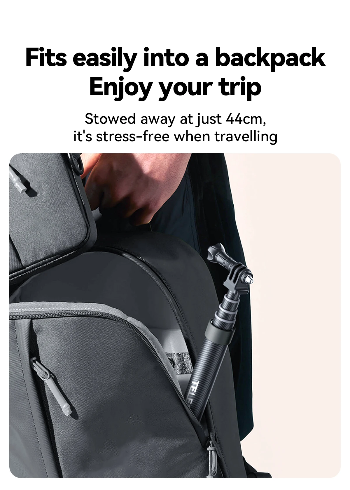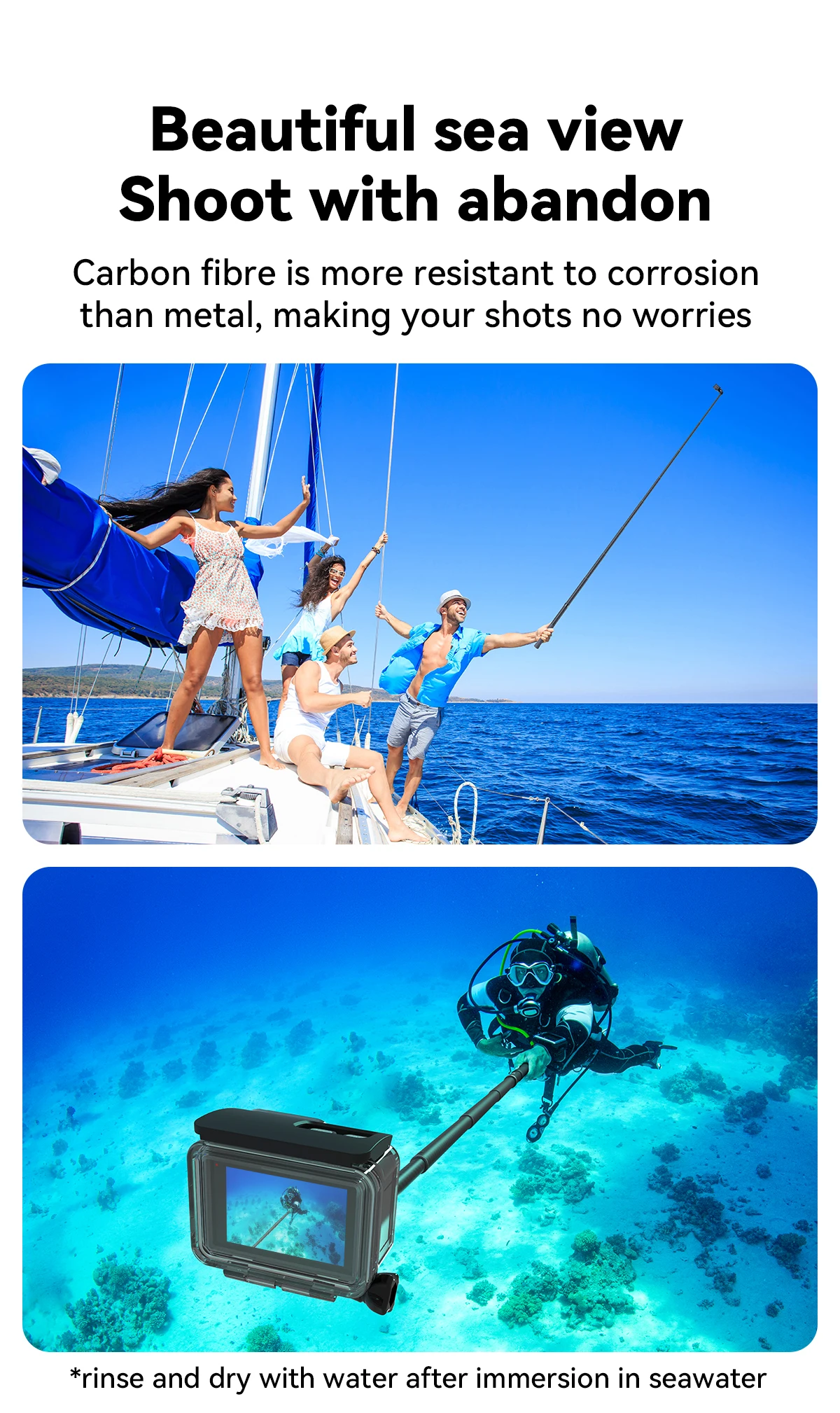 3. Hecho de fibra de carbono de alta calidad para la fuerza y 1/3 más ligero que un palo de selfie de aluminio del mismo tamaño.