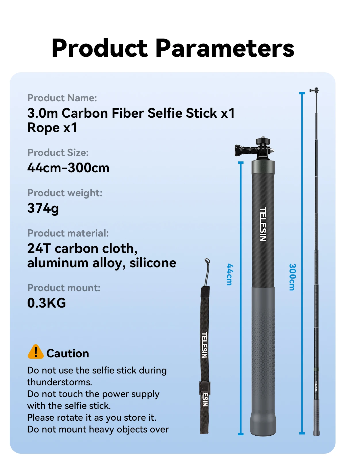 Comprar TELESIN-Palo de Selfie de fibra de carbono, monopié extensible con tornillo 1,2 Para GoPro Insta360 Osmo Action DJI Action Camera, 1/4 M, 3M