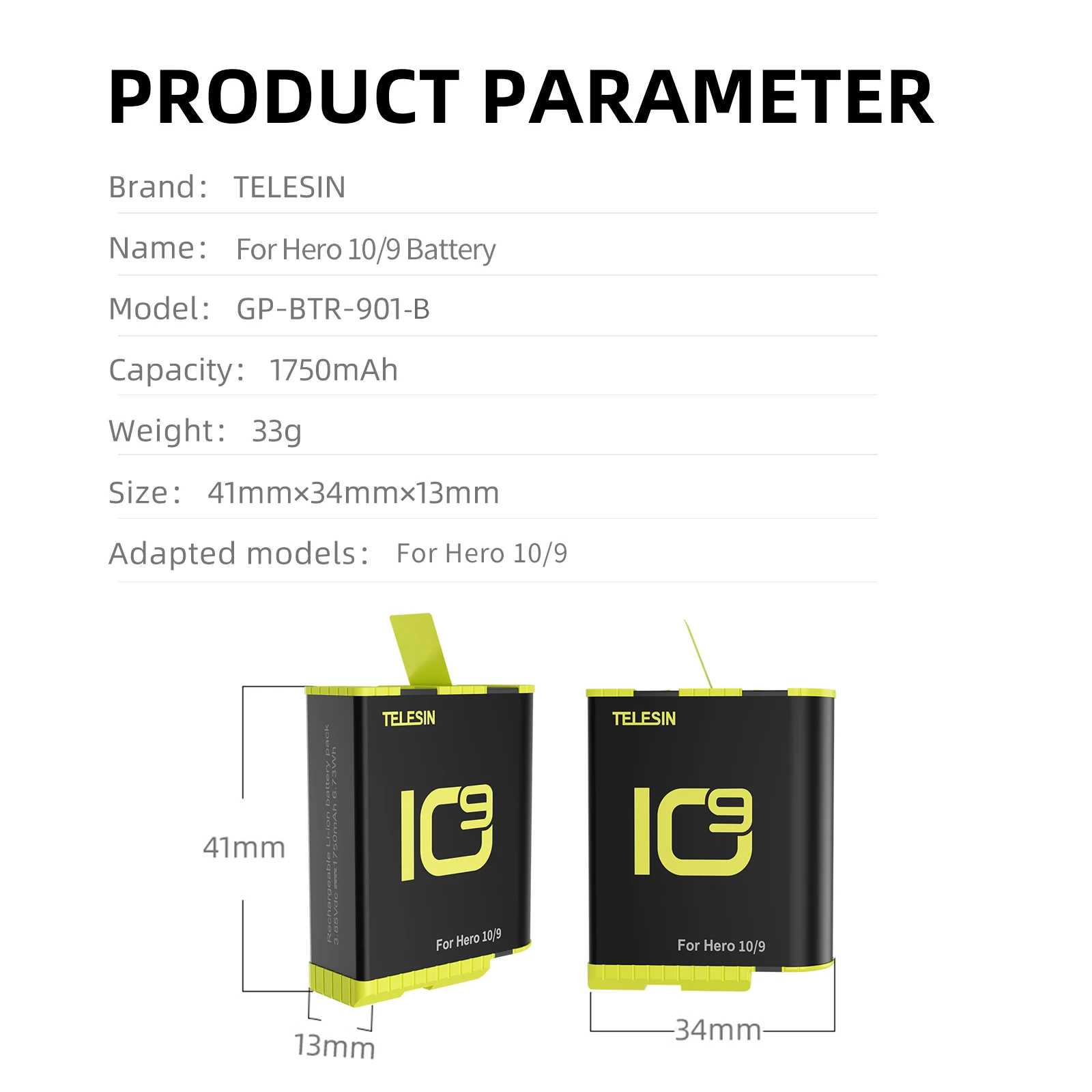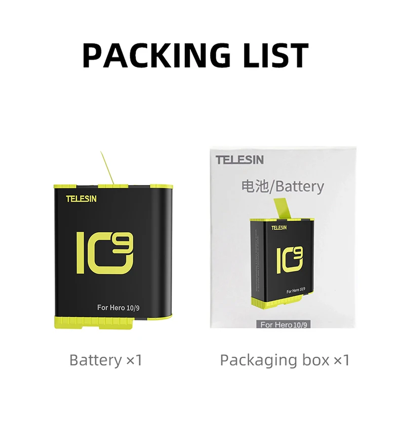 TELESIN-Paquete de 2 baterías de 1750mAh para Cámara de Acción GoPro Hero 9 10, con caja de batería para GoPro 9 10, color negro