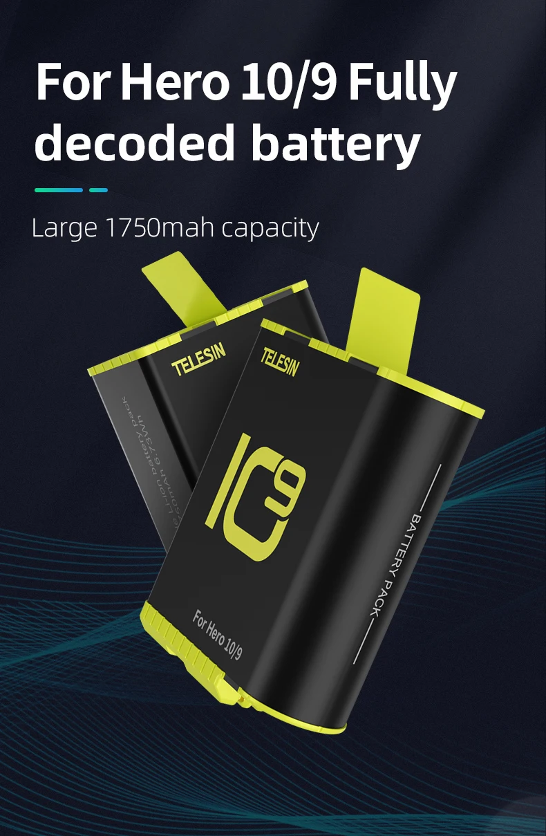 Comprar TELESIN-Paquete de 2 baterías de 1750mAh para Cámara de Acción, accesorios para GoPro Hero 9 10, con caja de batería, color negro