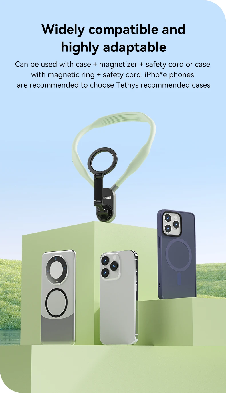 Cuando use la pieza magnética, seleccione una funda de teléfono suave y delgada, y fije la pieza magnética dentro de la caja para evitar el riesgo de desprendimiento debido a la fuerte fuerza magnética entre la pieza magnética y el soporte del cuello.
