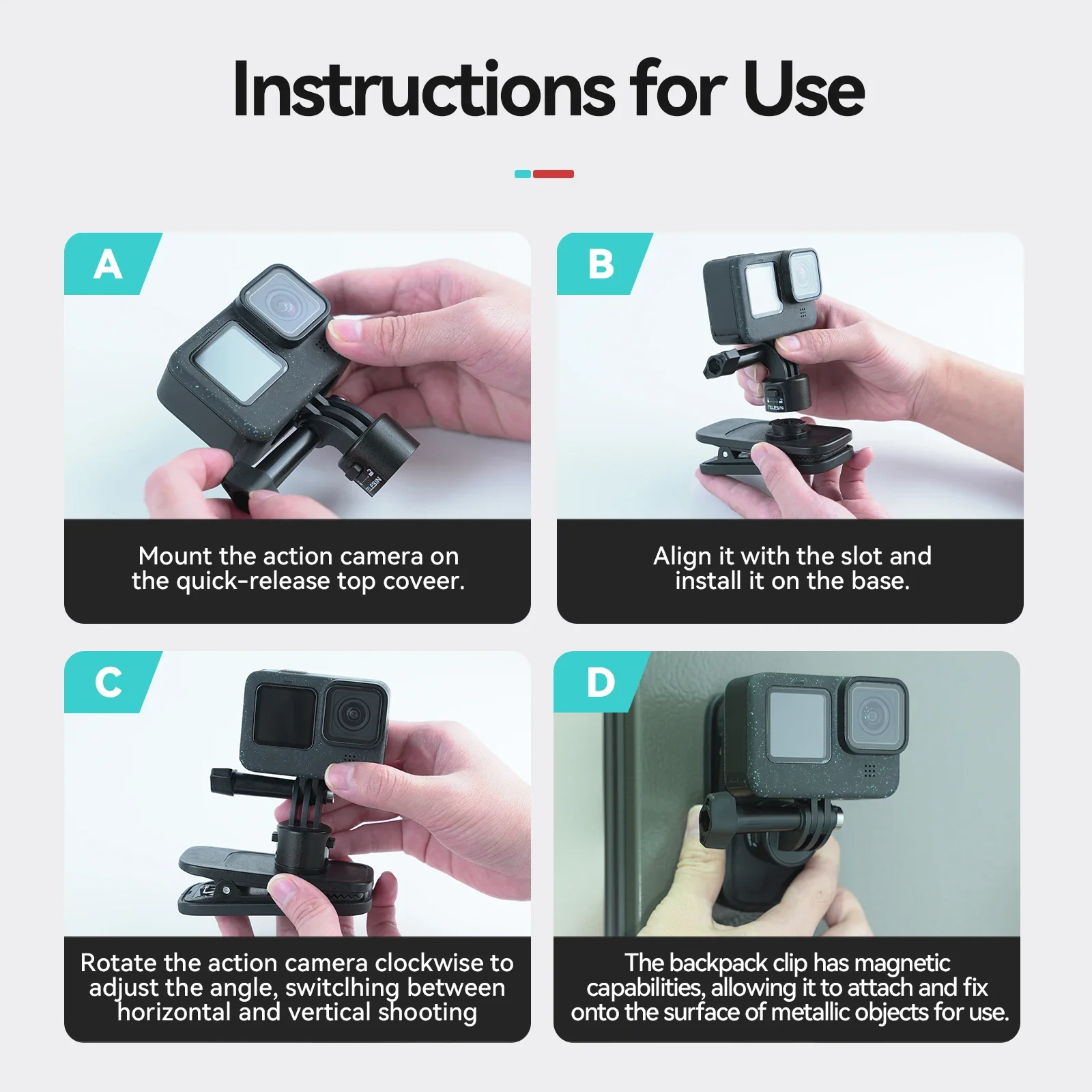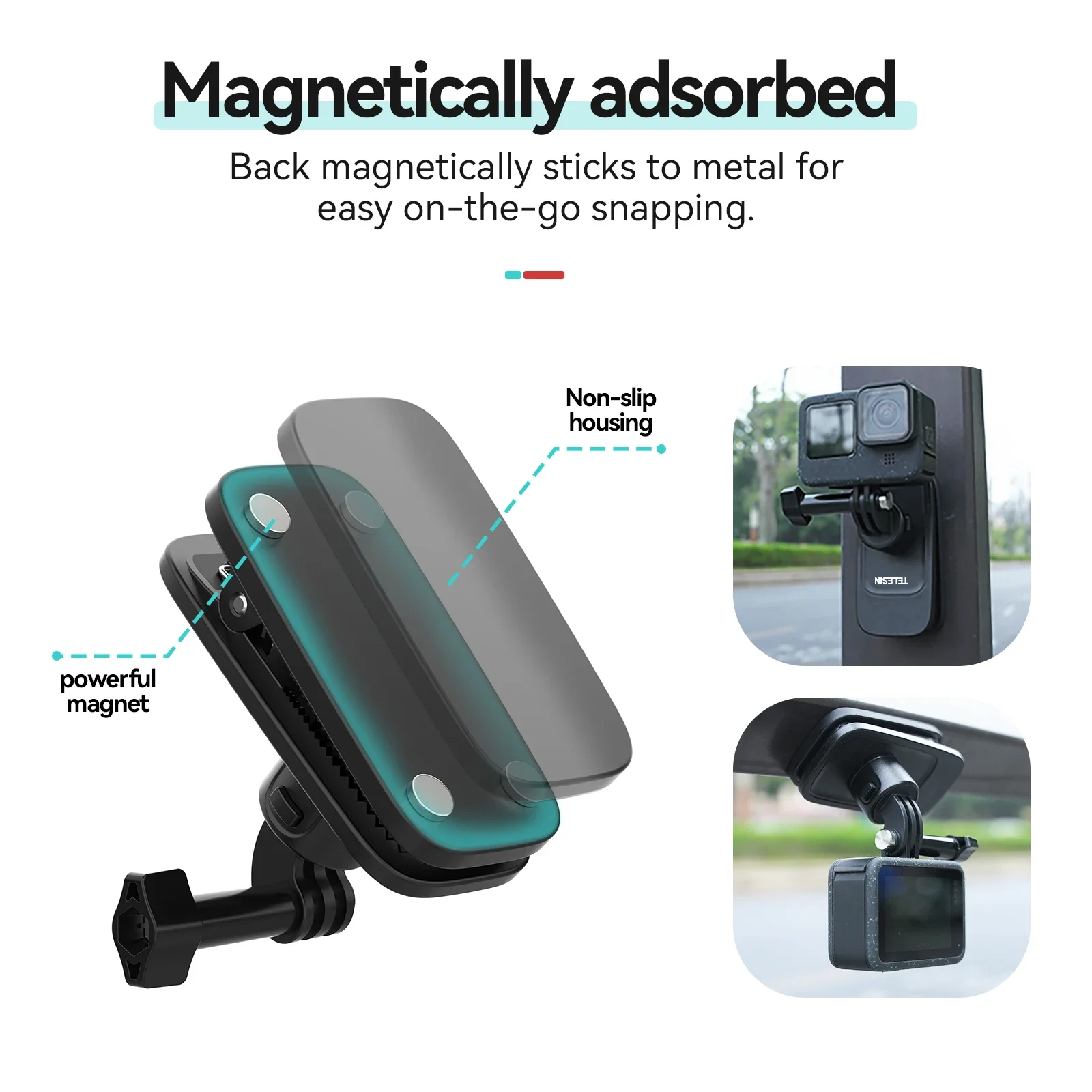 【Soporte magnético + Clip para mochila + Liberación rápida】 El último soporte magnético para mochila con liberación rápida, operación de montaje rápido en un segundo lugar, funciona con un soporte magnético en una superficie metálica y un soporte para correa de mochila en el cinturón del bolso de hombro, accesorios de montaje de usos múltiples para cámara de acción.