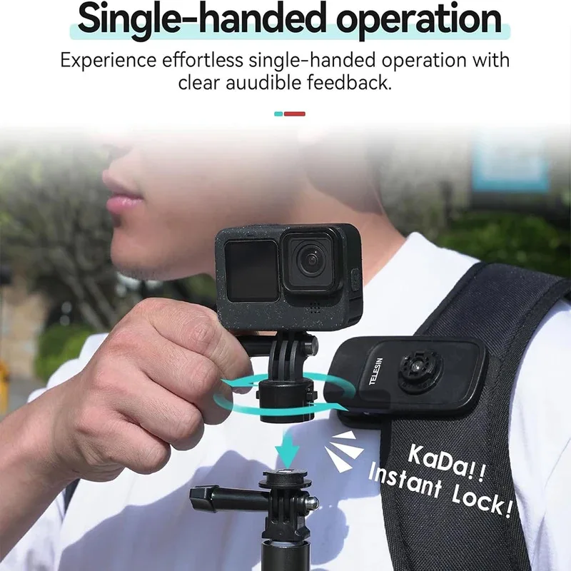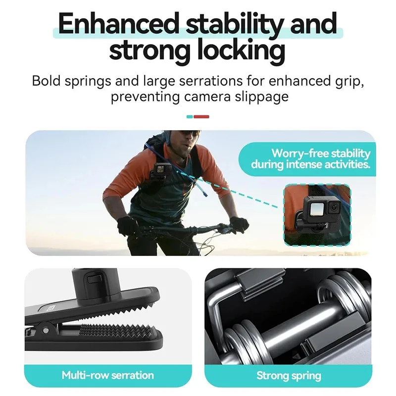 【Agarre fuerte y estable】 Clip para mochila Hecho de ABS de alta calidad, instalado con múltiples filas de dentados y resortes gruesos en el clip, se adapta perfectamente a tipos de correas para mochila, soporte para selfies POV perfecto para viajar, caminar, surfear al aire libre, paracaídas, senderismo, esquí, snowboard, escalada, ciclismo u otras actividades deportivas al aire libre, ¡libera tus manos!
