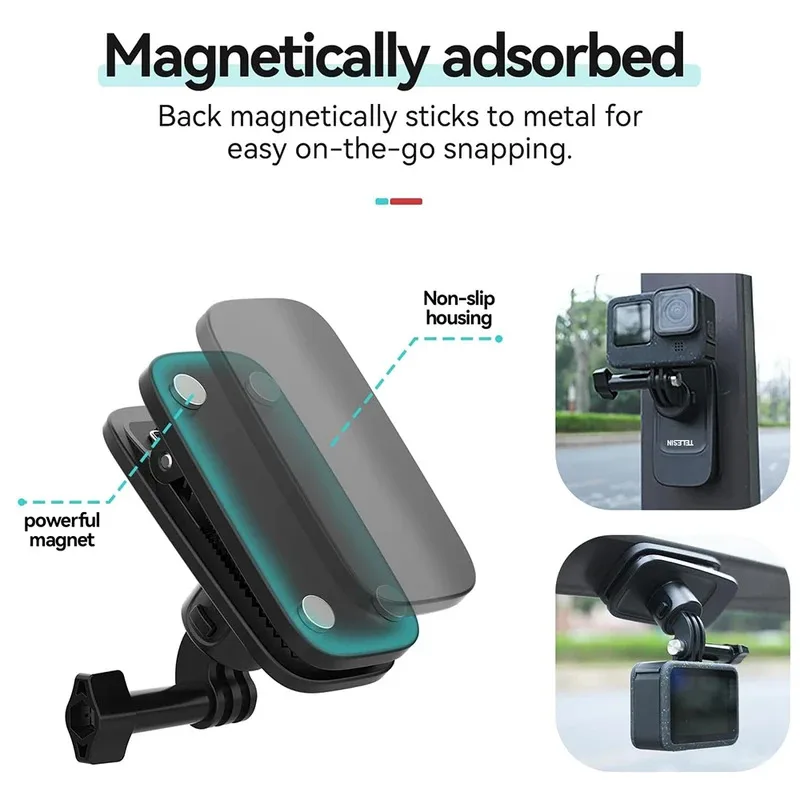 【Soporte magnético + Clip para mochila + Liberación rápida】 El último soporte magnético para mochila con liberación rápida, operación de montaje rápido en un segundo lugar, funciona con un soporte magnético en una superficie metálica y un soporte para correa de mochila en el cinturón del bolso de hombro, accesorios de montaje de usos múltiples para cámara de acción.