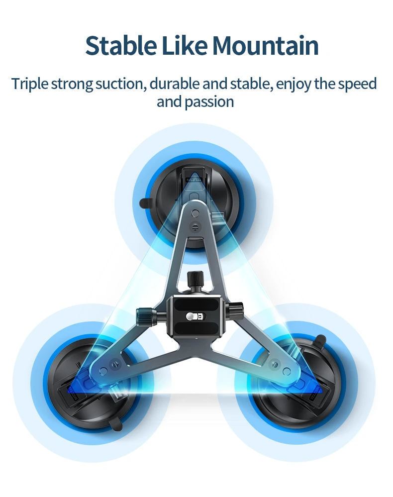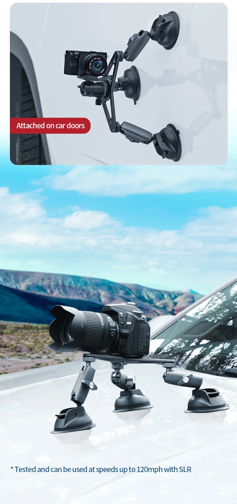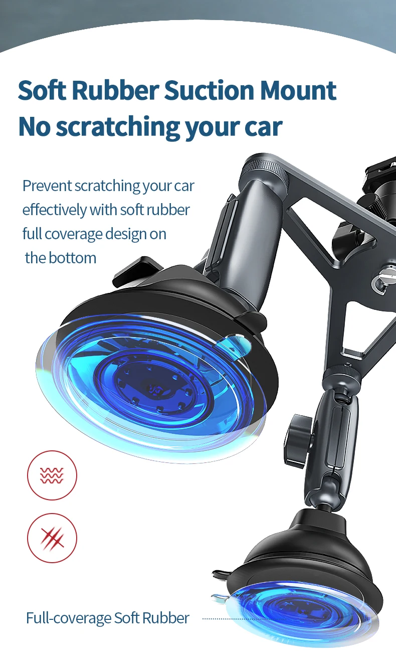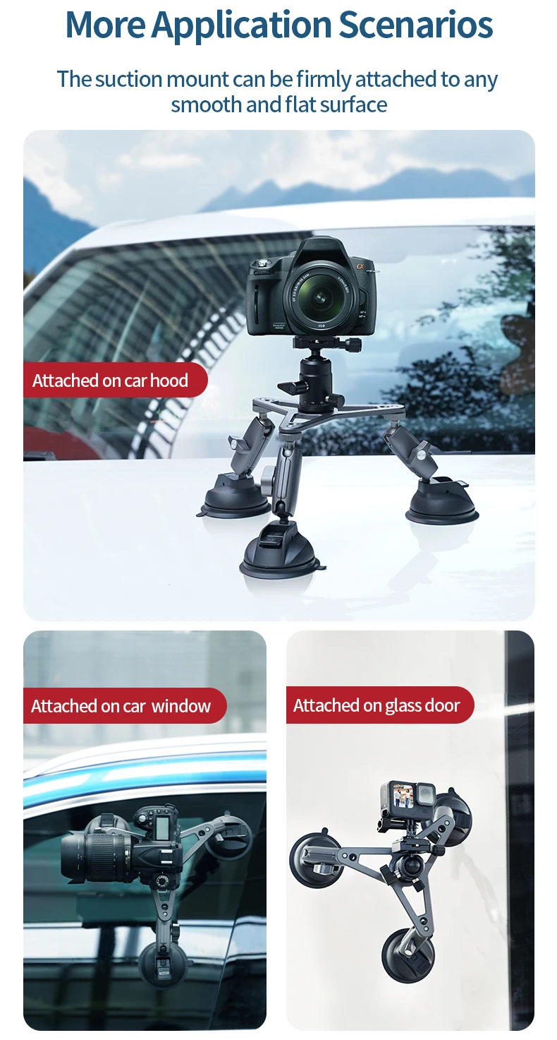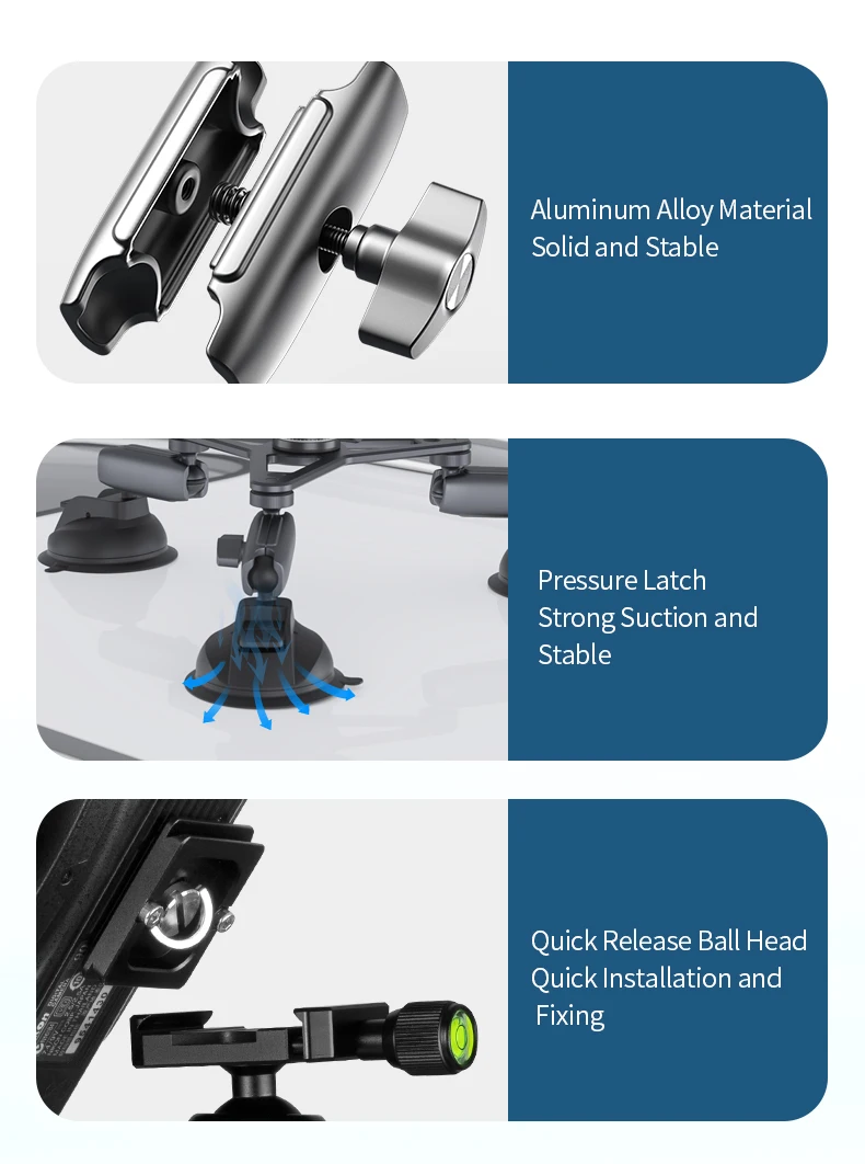 4. La altura se puede ajustar de forma flexible a diferentes posiciones, más altas o más bajas, para fijarla de forma más estable. La pata de succión 3 se puede fijar en diferentes planos horizontales, para que permanezca fija en una superficie de vidrio curva, superficies de cerámica metálica, parabrisas/parabrisas de automóvil, puerta de vidrio, puerta de automóvil, capó de coche, techo superior de coche, tapa de maletero, ventana de coche, etc.
