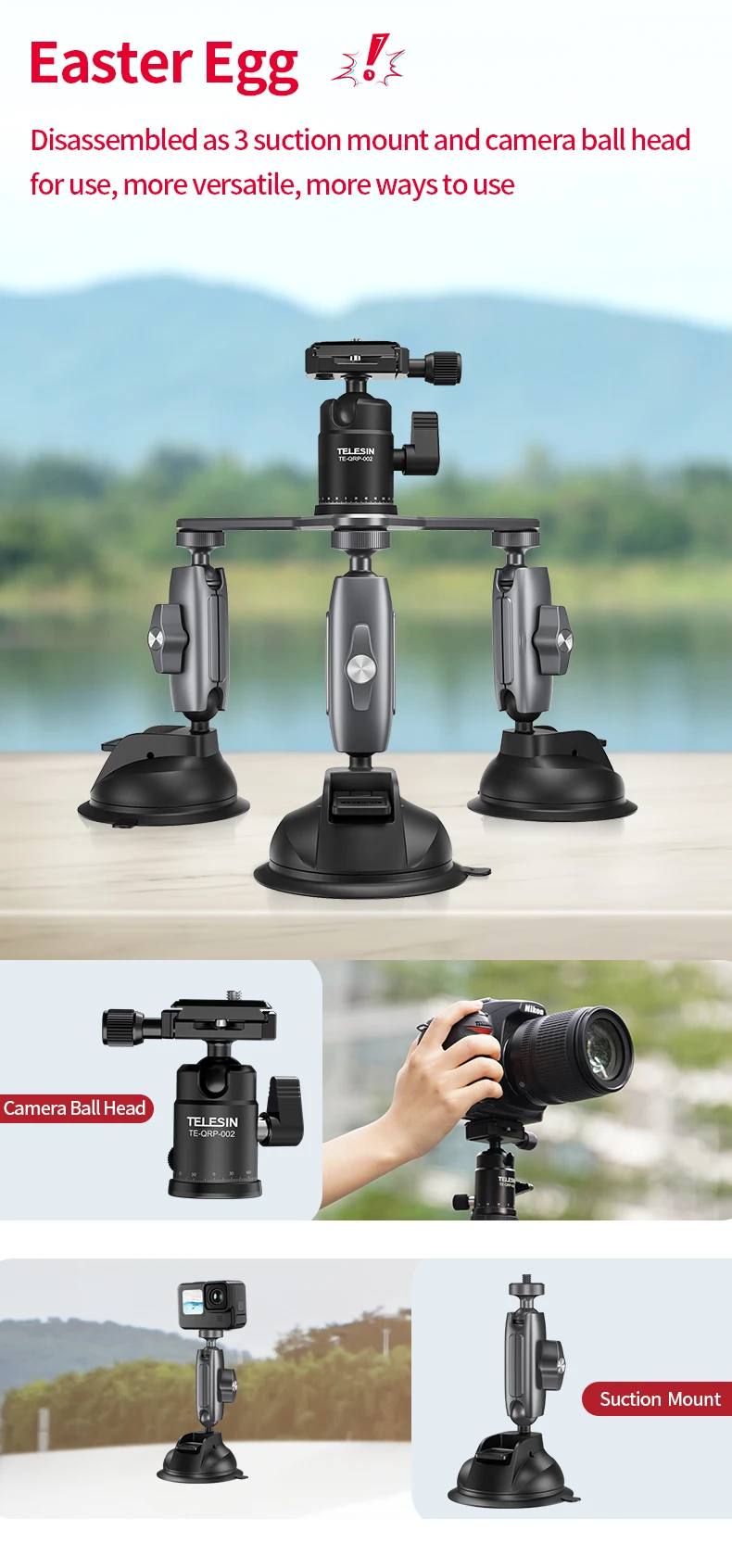 TELESIN ventosa soporte de trípode para coche montaje 360 ° cabeza de bola desmontable para GoPro 12 11 10 9 8 Insta360 DJI Osmo Action 2 para Canon Sony