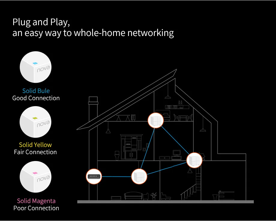 Nova MW6 funciona con la verdadera tecnología Mesh, un conjunto de tres unidades cubre hogares hasta 6.000 pies cuadrados con potentes señales Wi-Fi.Tecnología inteligente de selección de ruta automática para garantizar una red inalámbrica robusta y maximizar una Internet doméstica más rápida.