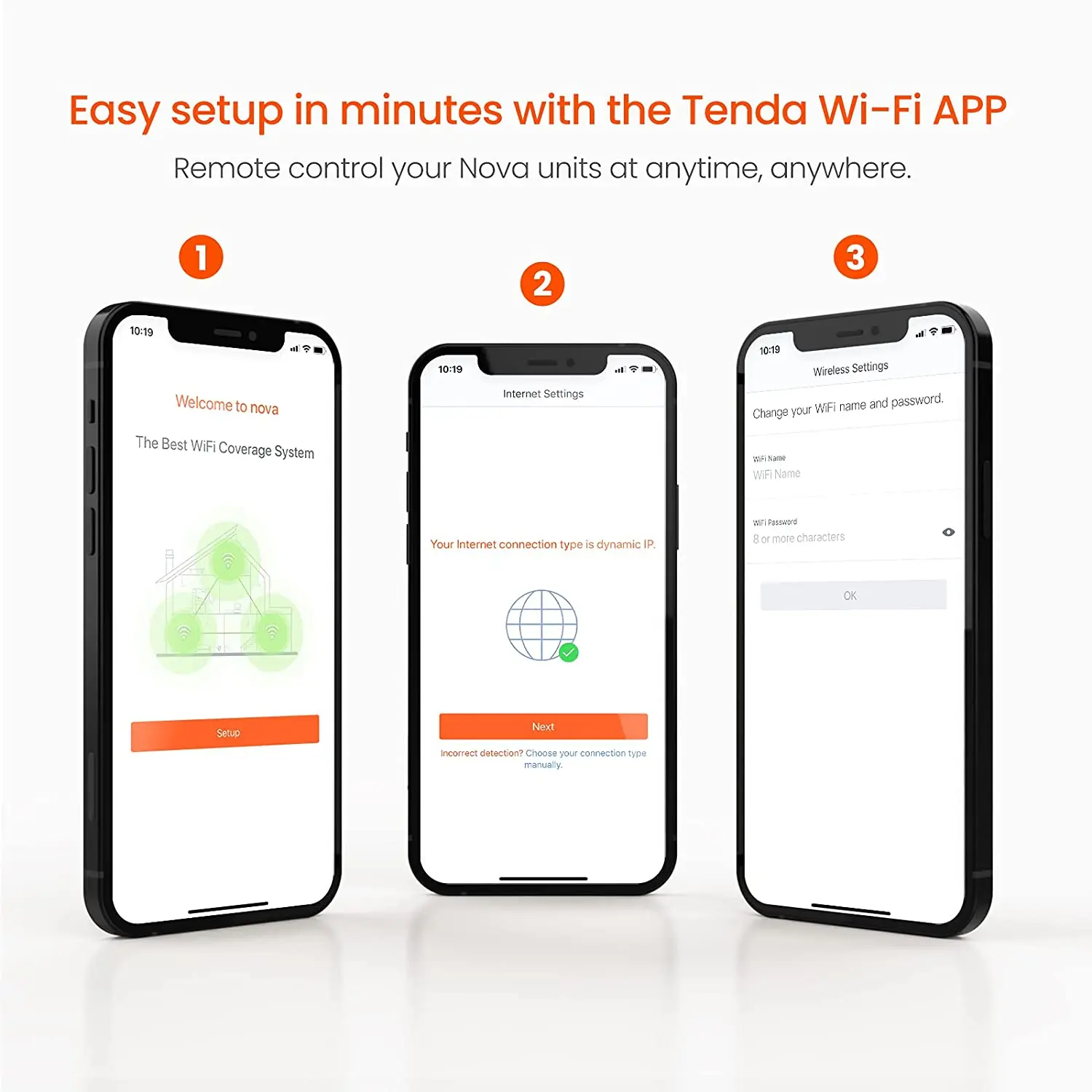 Fácil configuración en minutos: La aplicación Tenda Wi-Fi le ayuda a configurar, monitorear y administrar su red de malla Wi-Fi doméstica de forma fácil y rápida.Se puede agregar un nuevo nodo a las redes Nova existentes con 3 sencillos pasos.