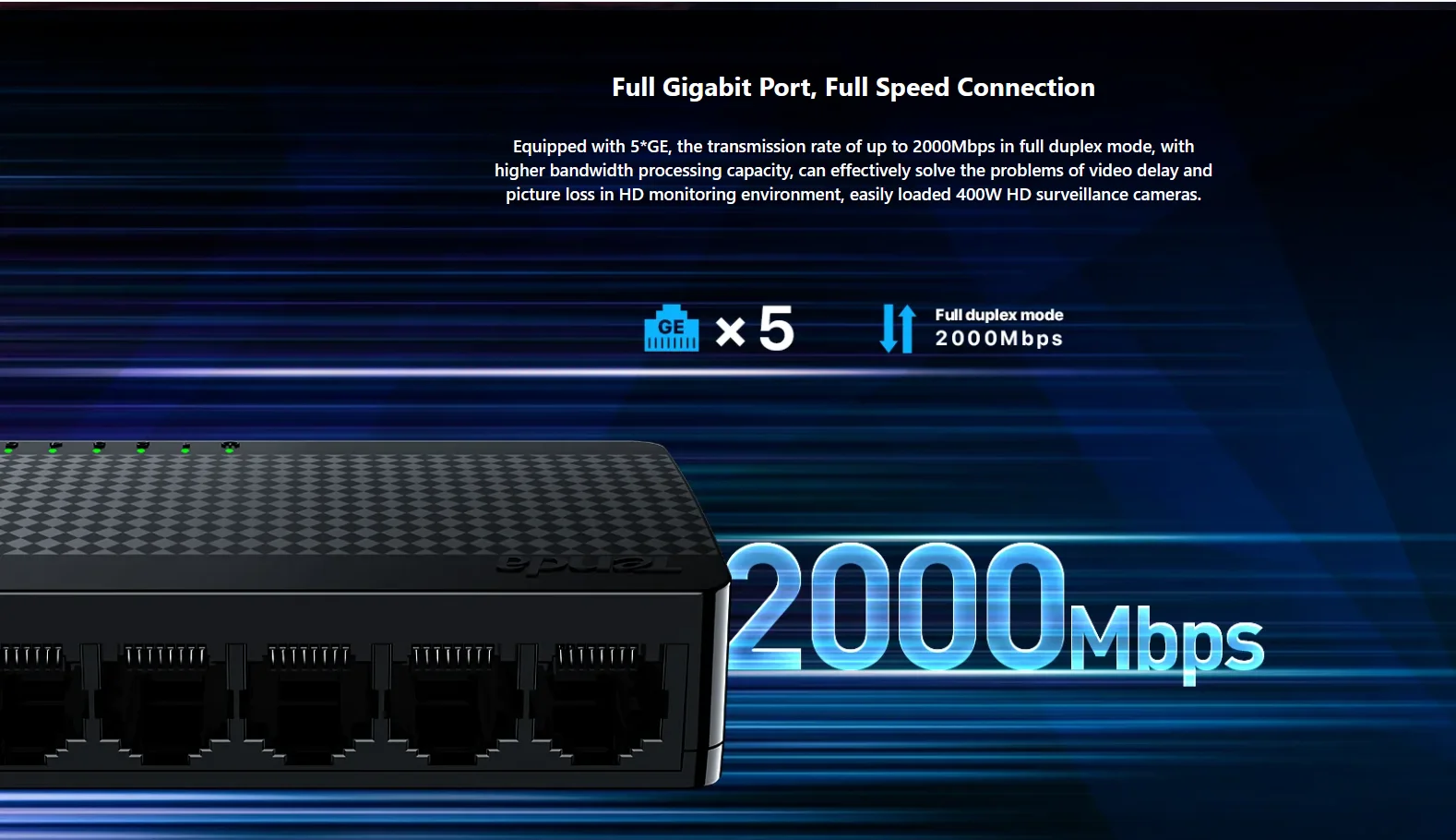 Equipped with 5*GE, the transmission rate of up to 2000Mbps in full duplex mode, with higher bandwidth processing capacity, can effectively solve the problems of video delay and picture loss in HD monitoring environment, easily loaded 400W HD surveillance cameras.
