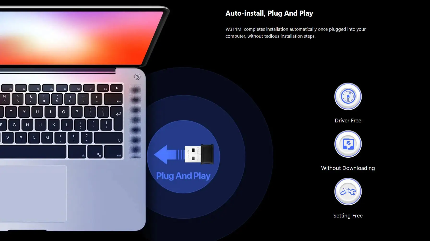 Con un exterior mini y portátil, el adaptador sin controlador Wi-Fi 6 De 286 Mbps W311MI se adapta de forma segura a su computadora y no afecta el uso de los puertos vecinos. Contiene un controlador interno, que completa la instalación automáticamente una vez conectado a su computadora sin tediosos pasos de instalación. Por lo tanto, no es necesario instalar manualmente el controlador con un CD-ROM o un archivo descargado de Internet. Es compatible con muchos sistemas operativos con Windows 11, Windows 10, Windows 7 y Linux y UOS, para cumplir con los requisitos de varios usuarios de computadoras de escritorio y portátiles para conexiones inalámbricas a Internet.