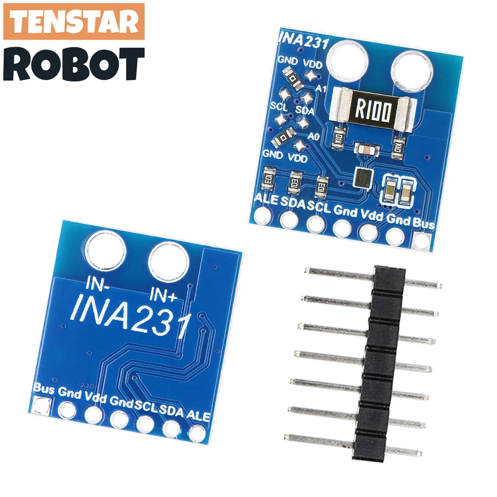 INA231 mide corriente en un voltaje de bus que oscila entre 0 V y 28 V y funciona con una única fuente que oscila entre 2,7 V y 5,5 V, lo que consume 330 μA (típico) de corriente de suministro.El rango de temperatura de funcionamiento del INA231 está clasificado de -40°C a +125°C. Existen dos versiones del INA231: el INA231A comienza a realizar conversiones continuas de derivación y voltaje de bus, mientras que el INA231B se inicia en modo de apagado de baja corriente; Este módulo utiliza la versión INA231A.