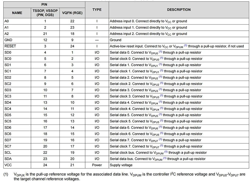 Debido a la presencia de una puerta conductora en el interruptor, el pin VCC se puede utilizar para limitar el alto voltaje máximo transmitido por el TCA9548A.Después de limitar el alto voltaje máximo, se pueden utilizar diferentes voltajes del bus en cada par, lo que permite que los dispositivos de 1,8 V, 2,5 V o 3,3 V se comuniquen con dispositivos de 5 V sin ninguna protección adicional.Para cada canal, las resistencias extraíbles externas aumentan el voltaje del bus hasta el nivel de voltaje deseado.Todos los pines de E/S tienen una tolerancia de 5 V.