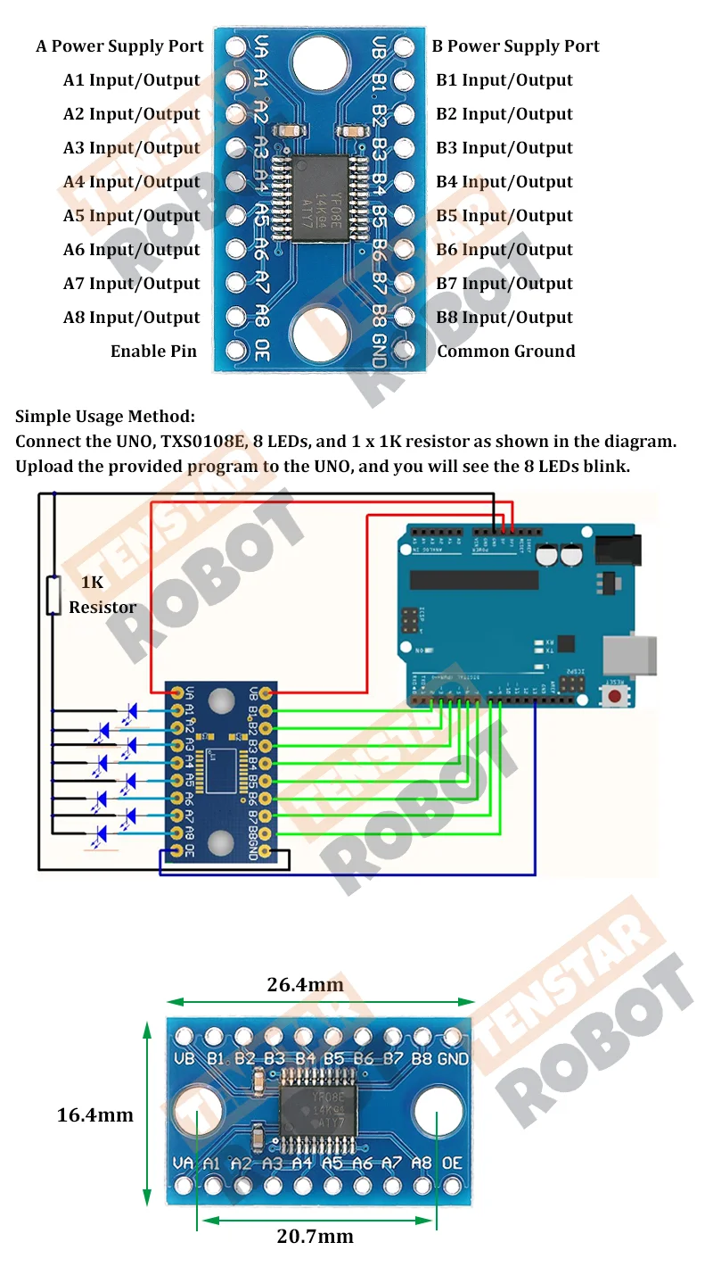 Este módulo emplea el chip TXS0108E, un traductor no inversor de 8 bits con dos fuentes de alimentación configurables independientes.El puerto A está diseñado para rastrear VCCA, que acepta cualquier voltaje de suministro de 1.2 V a 3.6 V.El puerto B está diseñado para rastrear VCCB, que acepta cualquier voltaje de suministro de 1.65 V a 5.5 V.Esto permite la traducción de voltaje bidireccional entre cualquiera de los siguientes nodos de suministro de bajo voltaje: 1.2 V, 1.5 V, 1.8 V, 2.5 V, 3.3 V y 5 V.Cuando la entrada de habilitación de salida (OE) es baja, todas las salidas están en un estado de alta impedancia.Para garantizar un estado de alta impedancia durante el encendido o apagado, el OE debe bajarse a través de una resistencia desplegable.