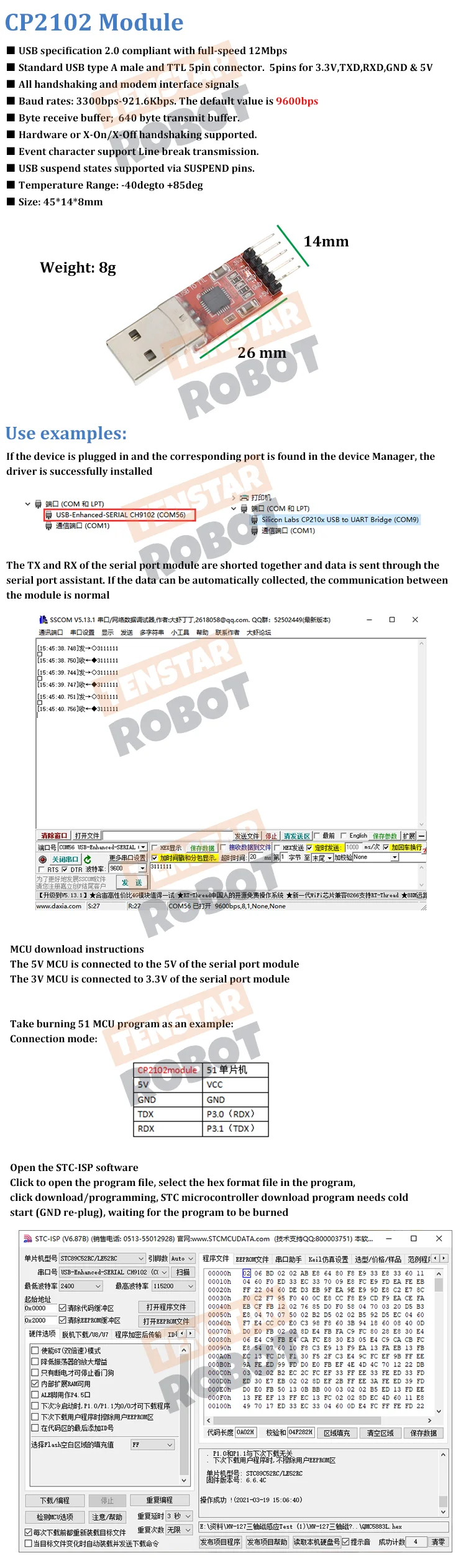 TENSTAR-módulo USB A TTL Serial UART STC, Cable de descarga, Super Brush Line, actualización tipo A, 5 pines, 2 piezas, CP2102