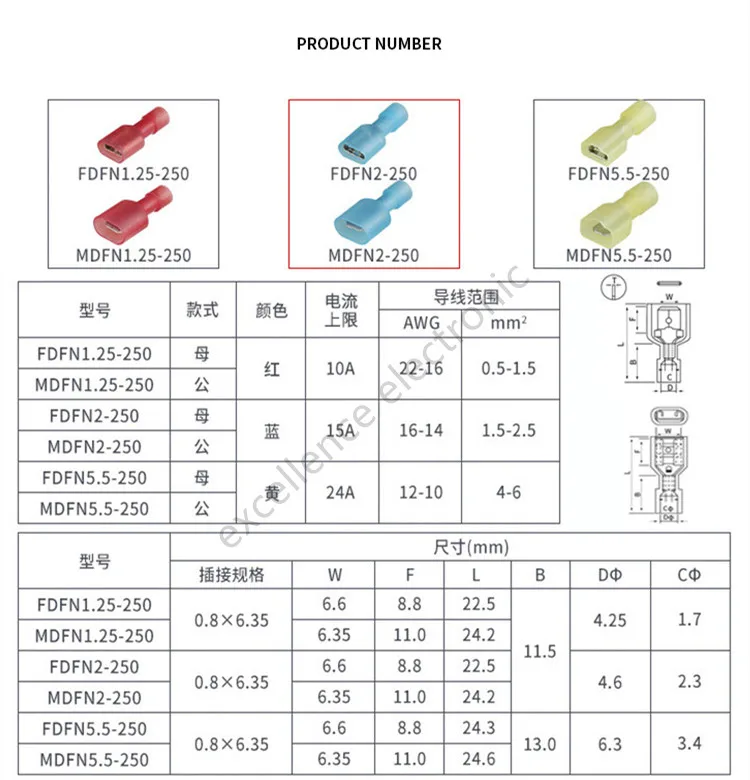 Comprar Terminal de crimpado aislado de nailon MDFN FDFN, Conector de pala de Cable eléctrico, Terminal de tope rápido, rojo, azul, amarillo, macho y hembra, 50 piezas