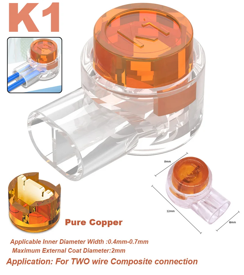 El terminal de botón tipo K1 es un tipo a prueba de humedad de una sola pieza, que adopta una conexión de un solo polo y se utiliza para la conexión directa de dos cables. El diámetro del cable aplicable es de 0,4-0,7mm, y el diámetro exterior máximo de aislamiento es de 1,52mm.
