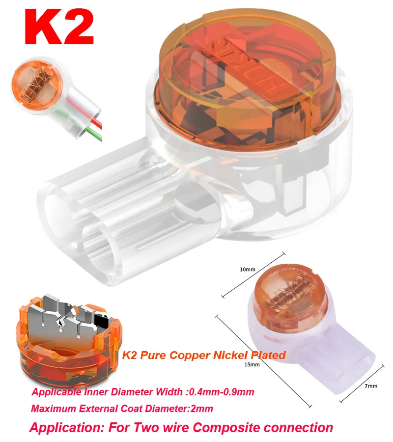 El terminal de botón tipo K2 es un tipo único a prueba de humedad, adopta Conexión de doble Polo y se utiliza para la conexión directa de dos cables. El diámetro del cable aplicable es de 0,4-0,9mm, y el diámetro exterior máximo de aislamiento es de 2,08mm.