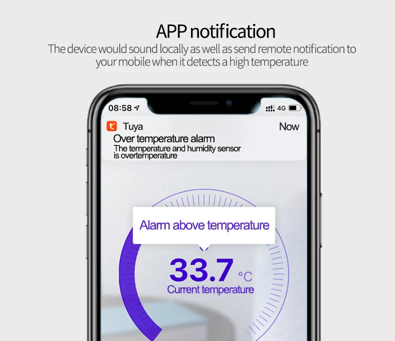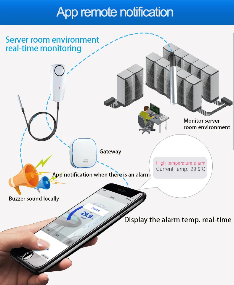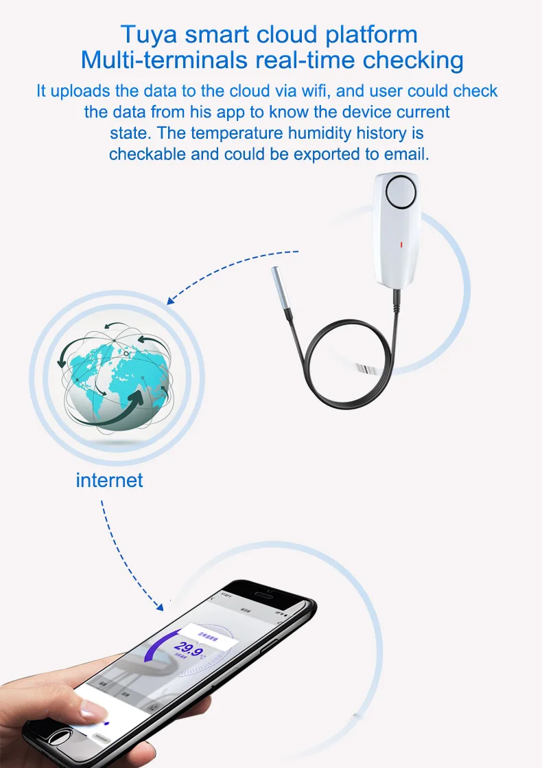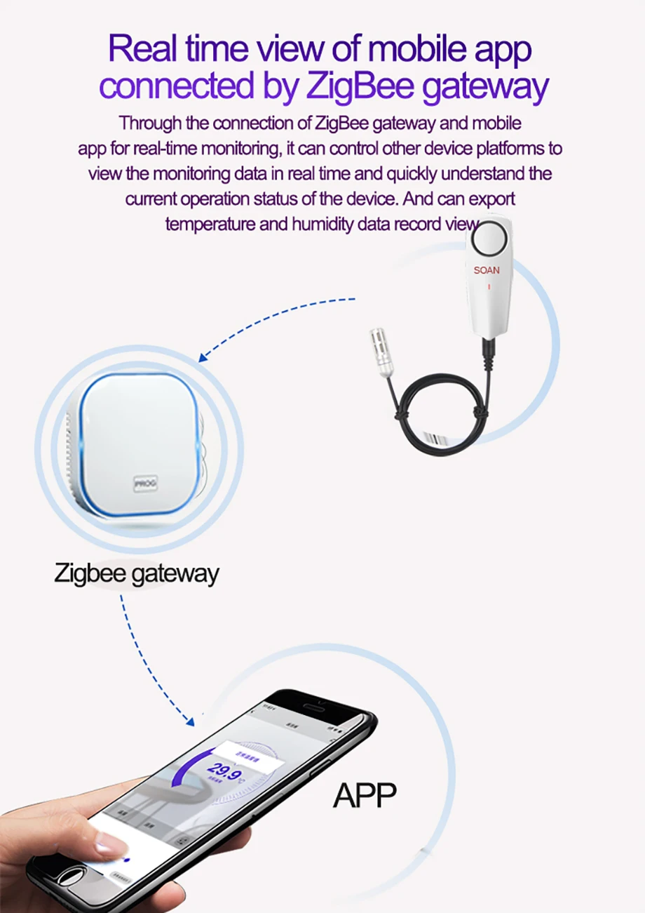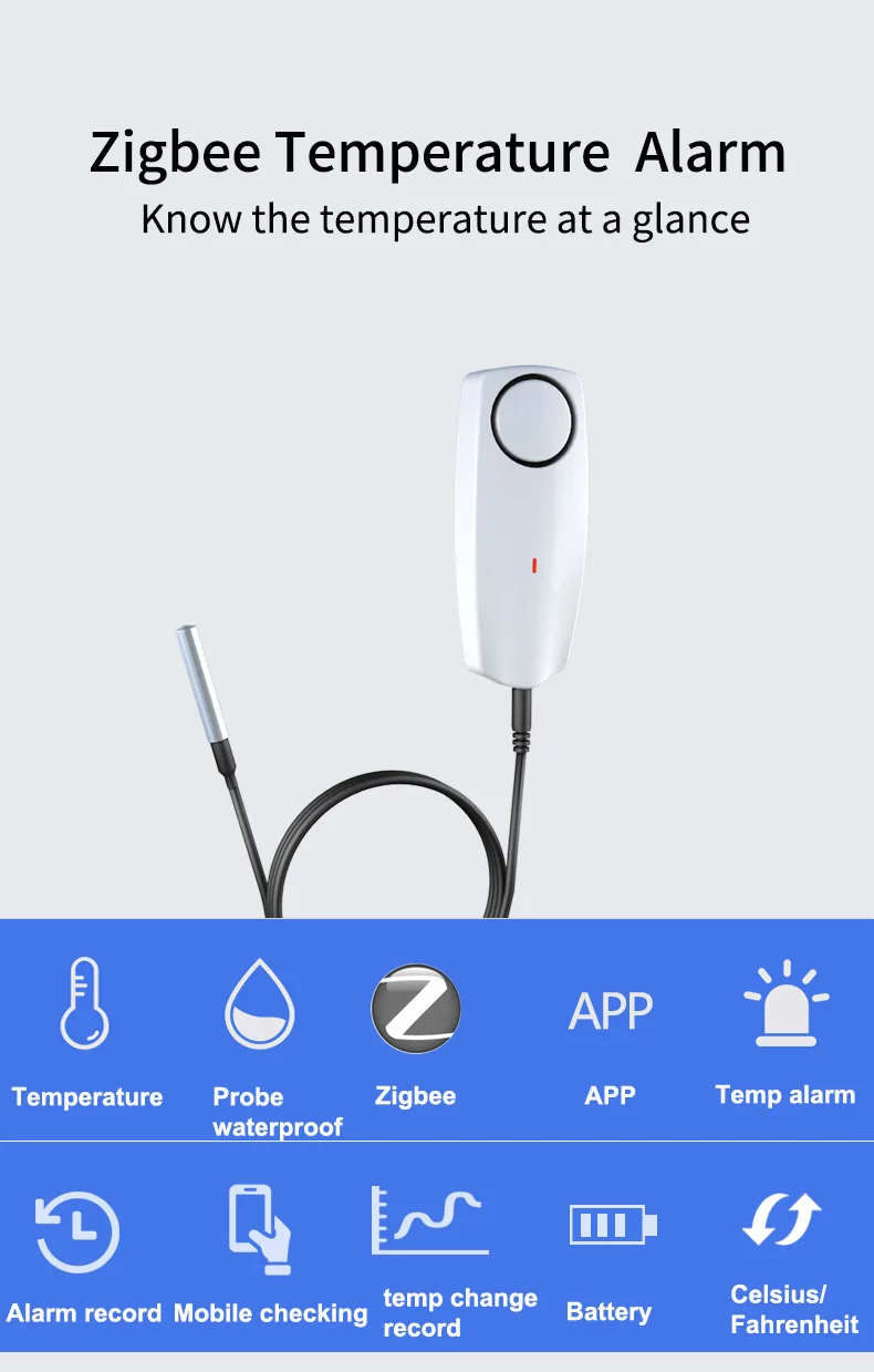 1.Descripción general del productoLa alarma de temperatura y humedad zigbee funciona con la puerta de enlace zigbee.Utiliza análisis de señal avanzadoy tecnología de procesamiento para proporcionar al usuario detección de ultra alta precisión y rendimiento de alarma anti-falsaque está diseñado para garantizar la estabilidad del producto.Cuando la temperatura y humedad de la detección.El entorno excede los límites superior e inferior establecidos, establecería la conexión con otros dispositivos inteligentes, así comoinformar al usuario para que pueda monitorear remotamente la temperatura y humedad premisa en tiempo real.El producto es ampliamente utilizado en áreas residenciales familiares, villas inmobiliarias, edificios industriales, computadoras.habitaciones, almacenes, edificios de oficinas y otros lugares.2.Características1) Aspecto ultrapequeño, diseño simple que ahorra espacio limitado.2) Se puede utilizar con fuente de alimentación USB o batería; El tiempo de espera de la batería es de más de un año.3) Admite la exportación de datos de temperatura y humedad, almacenamiento de datos en la nube de hasta 7 días4) Amplia cobertura, fuerte penetración en la pared, buen rendimiento antiinterferencias, bajo calentamientoy consumo de energía5) Integración de múltiples redes, cambio libre entre WIFI y Zigbee.El dispositivo podría configurar el enlaceIncluso si no hay red WiFi.6) Garantía de seguridad, protección de la privacidad.Utiliza el método de cifrado de alto nivel para transmitir información.a través de WIFI y Zigbee para garantizar la seguridad de la comunicación de la red y evitar intrusiones maliciosas.3Rango de alarma de temperatura: -20-85