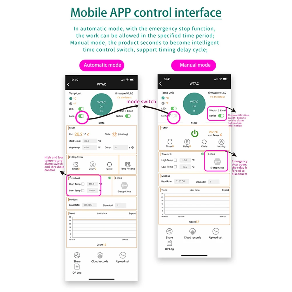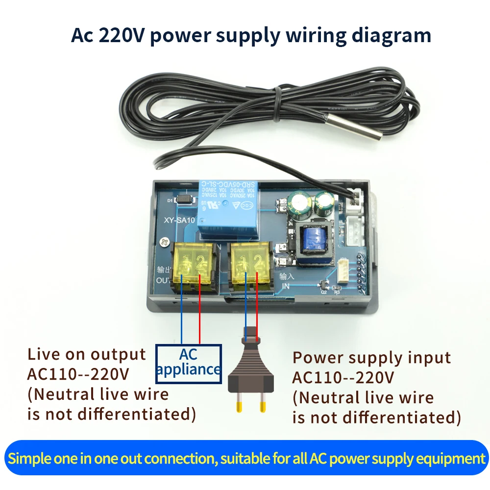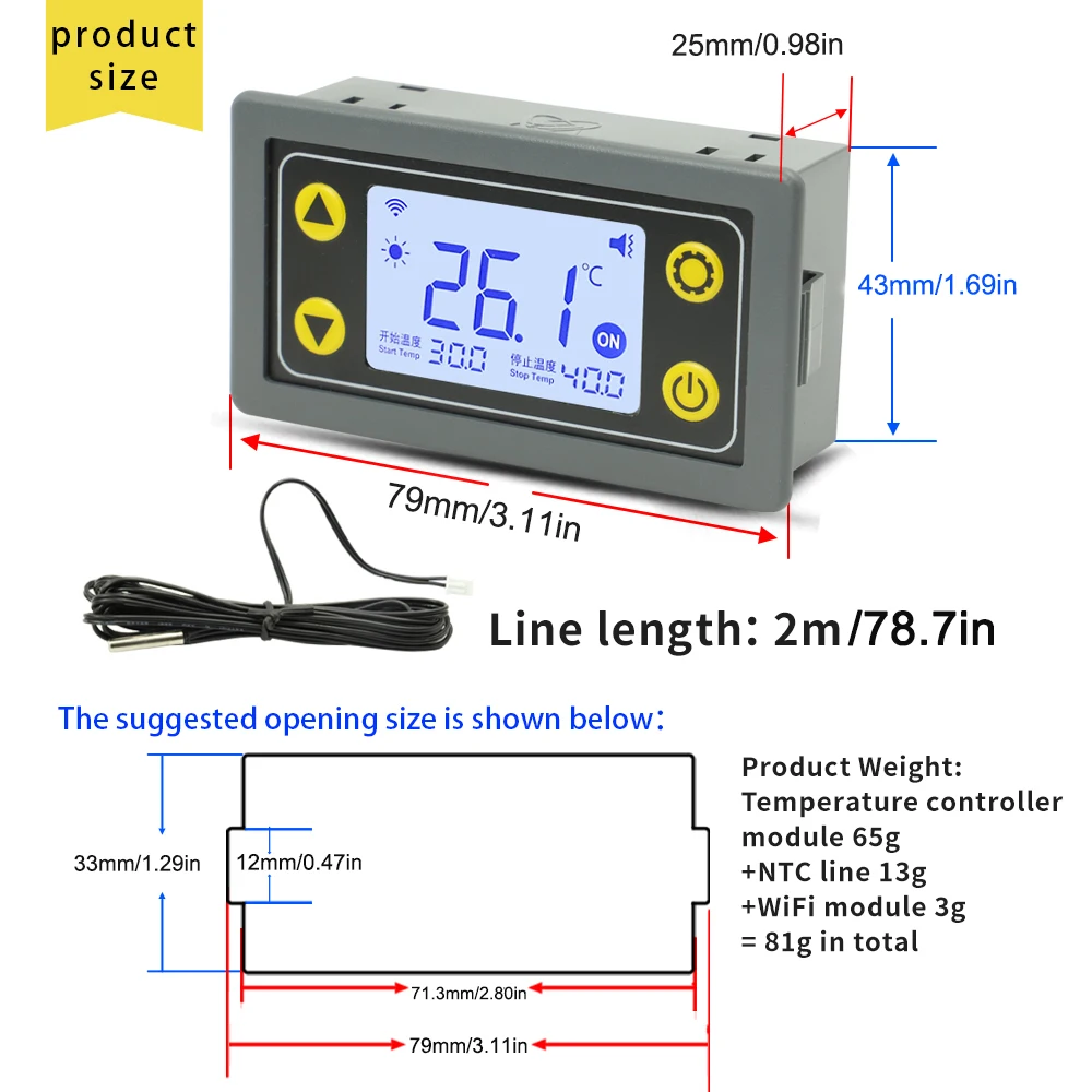 CC6-30 V:1.Penetración de LAN, comunicación en tiempo real, control remoto de red externa, distancia ilimitada2.Reserva de temperatura, inicio y parada con un solo botón3.La pantalla digital es clara y visible, sin temor a cambios en el entorno externo, con tres pantallas en una pantalla y fácil lectura.4.Control de aplicación remota, interruptor de sincronización manual/automático5.Medición precisa y amplia gama de uso.Parámetros:Nombre del producto: controlador de temperatura inteligente remoto WIFIFuente de alimentación de entrada: DC6-30VTipo de salida: interruptor de relé de 1 víaModelo de sonda: 10K NTC 3950BLongitud de la sonda: sonda impermeable de 2 mDimensión externa: 79*43*25 (MM)Peso neto del producto: 72gControl máximo: corriente dentro de 10A/30AFunciones adicionales: aviso de timbre+control de retroiluminaciónRango de control de temperatura: - 40~110° CPrecisión del control de temperatura: 0,1 CRango de medición de temperatura: - 40~110° CTenga cuidado:1.El producto está equipado con sensor impermeable NTC de forma predeterminada, sin sensor digital 18B202.Cuando se conecta el sensor 18B20, la temperatura cambiará automáticamente a la temperatura de prueba de 18B20.3.El relé solo actúa como un interruptor y no está energizado para la salida.Consejos:P: ¿Qué pasa con permitir que el equipo funcione de las 6:00 p.m?Respuesta: Simple, simplemente agregue el temporizador de parada de emergencia, apague la parada de emergencia a las 6 a. m. y encienda la parada de emergencia a las 5 p.m.P: ¿Es posible calentar hasta 30?° a las 6:00 y 50° a las 4 p.mR: Es muy fácil.Simplemente ingrese a la función de reserva de temperatura y agregue dos reservas para resolver el problema.P: Solo se necesita detección de temperatura, ¿se puede controlar mediante un interruptor de sincronización?Respuesta: Sí, configure el modo de trabajo del producto en modo manual y use el interruptor inteligente para detectar la temperatura en segundos.P: ¿Puede el producto enviar una alarma al teléfono móvil?R: Admite notificación de alarma.Puede recibir notificaciones de alarma vinculando WeChat y siguiendo la cuenta oficial "Xinyi Cloud Link".P: ¿Se pueden registrar datos de temperatura?¿Nos conviene analizarlos?R: El producto puede almacenar datos por hasta 15 días y la velocidad de carga puede ser de hasta 1 pieza/segundo, que se puede exportar en cualquier momento.CA 110-220 V:1.Utilice materiales de alta calidad con calidad garantizada.2.Reserva de temperatura, inicio y parada con un solo botón3.La pantalla digital es clara y visible sin temor a cambios en el entorno externo.4.Notificación de alarma, grabación en la nube, actualización remota de firmware5.Amplia gama de aplicacionesParámetros:Potencia de entrada: CA 110-220 VTipo de salida: salida en vivo (CA 110-220 V)Modelo de sonda: 10K NTC 3950BLongitud de la sonda: sonda impermeable de 2 mDimensión externa: 79*43 '25 (MM)Peso neto del producto: 81 gControl máximo: potencia dentro de 2000WFunciones adicionales: aviso de timbre+control de retroiluminaciónRango de control de temperatura: - 40~110° CPrecisión del control de temperatura: 0,1° CRango de medición de temperatura: - 40~110° CTenga cuidado:1.El producto está equipado con sensor impermeable NTC de forma predeterminada, sin sensor digital 18B202.Cuando se conecta el sensor 18B20, la temperatura cambiará automáticamente a la temperatura de prueba de 18B20.3.La salida en vivo del relé (CA 110-220 V) no distingue entre la línea cero y la línea en vivoConsejos:P: ¿Qué pasa con permitir que el equipo funcione de las 6:00 p.m?Respuesta: Simple, simplemente agregue el temporizador de parada de emergencia, apague la parada de emergencia a las 6 a. m. y encienda la parada de emergencia a las 5 p.m.P: ¿Es posible calentar hasta 30?° a las 6:00 y 50° a las 4 p.mR: Es muy fácil.Simplemente ingrese a la función de reserva de temperatura y agregue dos reservas para resolver el problema.P: Solo se necesita detección de temperatura, ¿se puede controlar mediante un interruptor de sincronización?Respuesta: Sí, configure el modo de trabajo del producto en modo manual y use el interruptor inteligente para detectar la temperatura en segundos.P: ¿Puede el producto enviar una alarma al teléfono móvil?R: Admite notificación de alarma.Puede recibir notificaciones de alarma vinculando WeChat y siguiendo la cuenta oficial "Xinyi Cloud Link".P: ¿Se pueden registrar datos de temperatura?¿Nos conviene analizarlos?R: El producto puede almacenar datos por hasta 15 días y la velocidad de carga puede ser de hasta 1 pieza/segundo, que se puede exportar en cualquier momento.