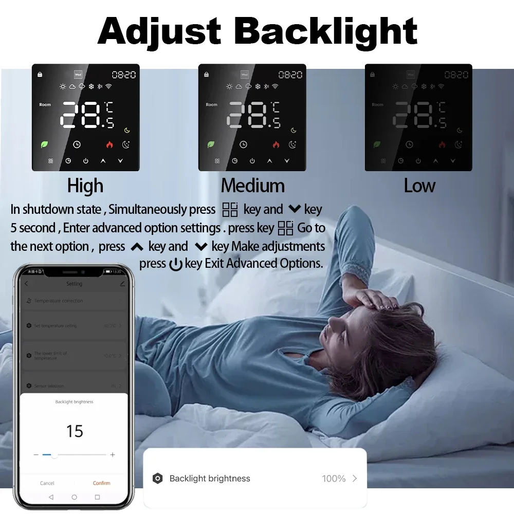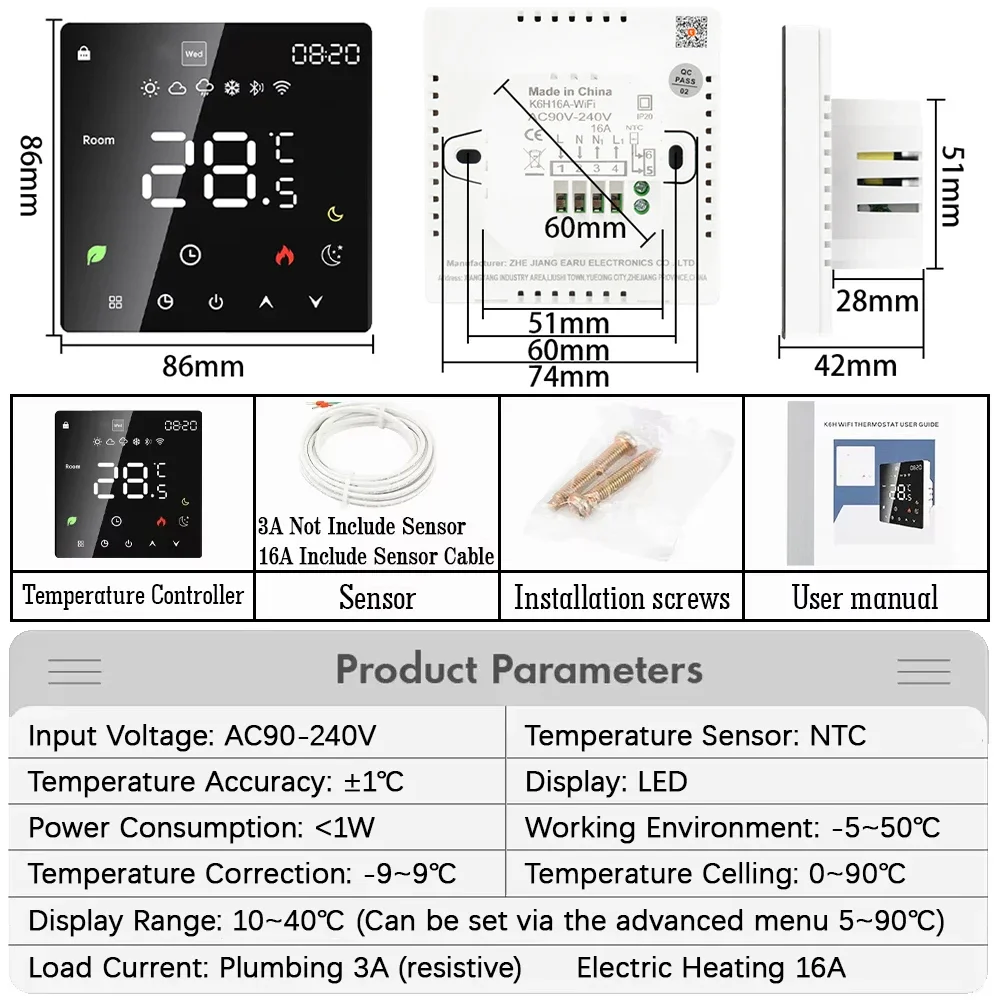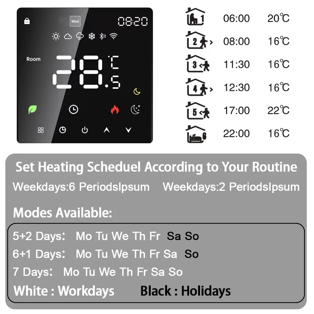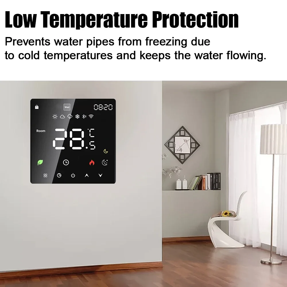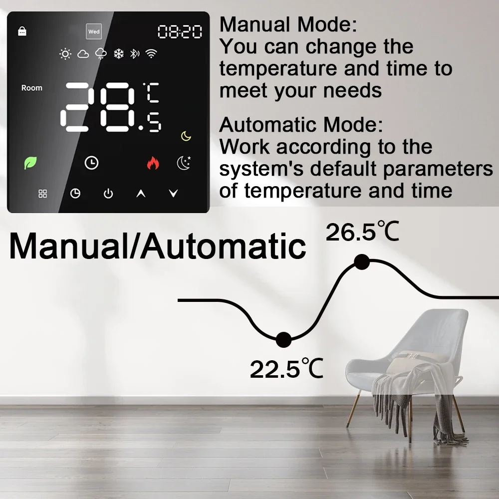 El termostato inteligente de calentamiento de agua es adecuado para el control de la temperatura interior de sistemas de calentamiento de agua por suelo radiante domésticos o sistemas de calefacción como calderas.Puede ser ampliamente utilizado en Asia, Europa y Estados Unidos.Combina perfectamente tu estilo de decoración y respalda la personalización.