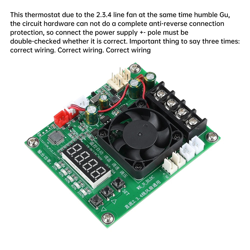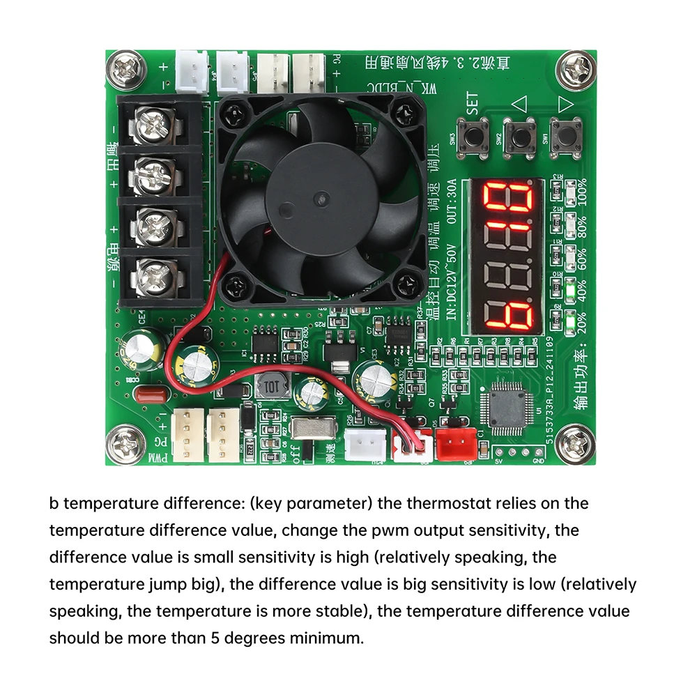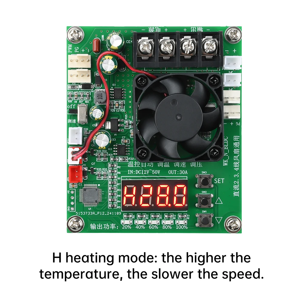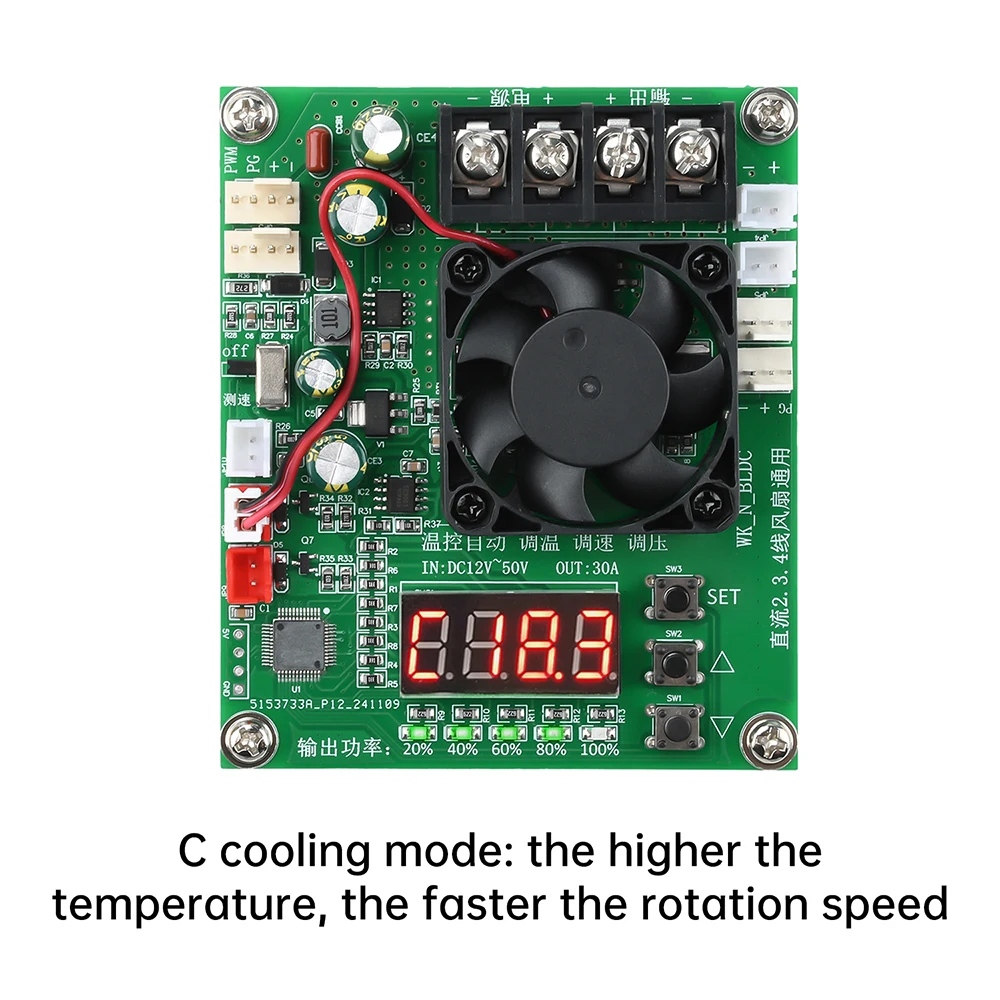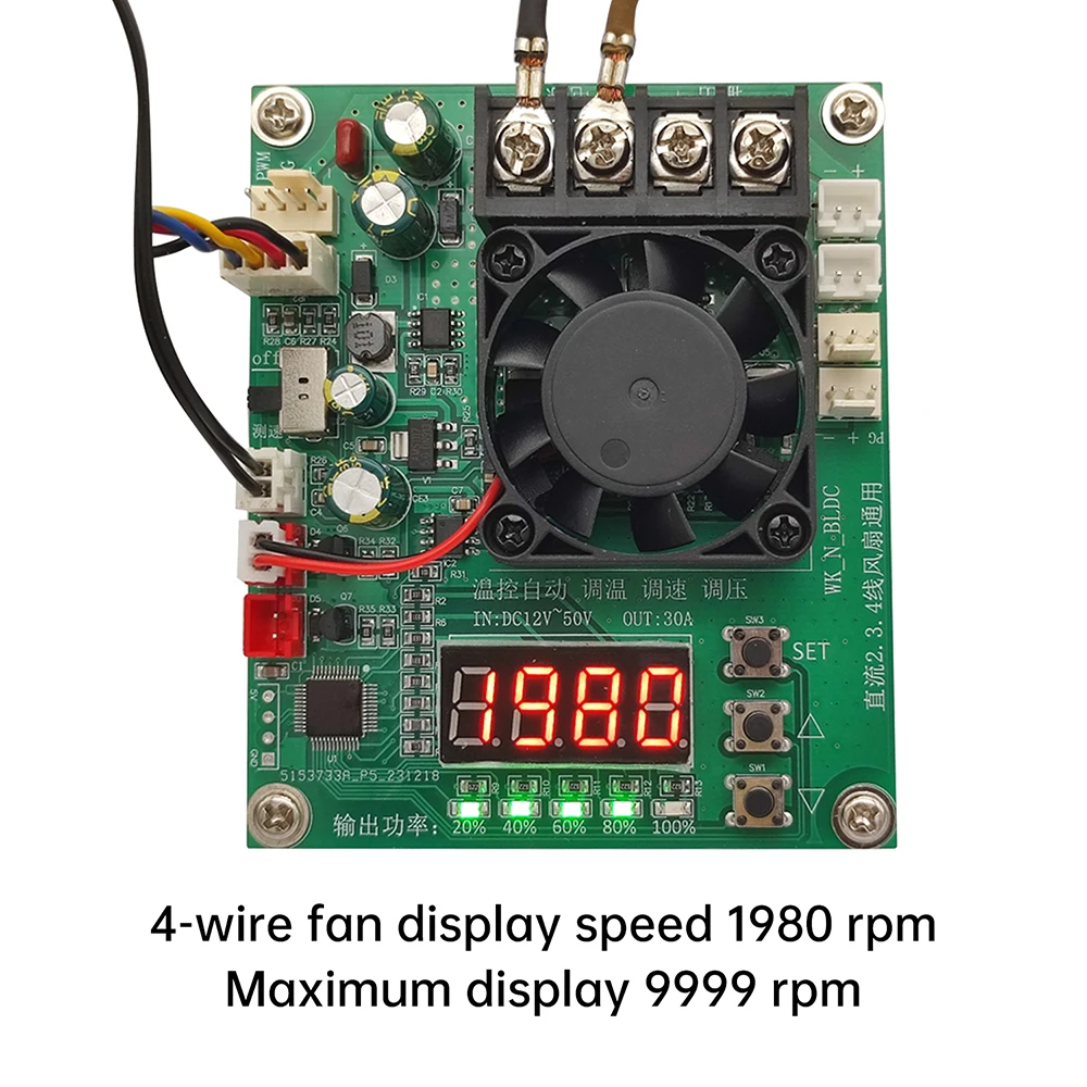 recogida de 2.Control de sincronización del ventilador de 3.4 hilos (de el cual ventilador de 4 hilos con visualización de velocidad y función de detección de fallas de parada);Salida de corriente de 30 A de alta potencia, indicador de porcentaje de potencia de 5 salidas, sonda de temperatura NTC de alta precisión integrada (control inteligente del funcionamiento del ventilador de refrigeración, detecta la temperatura de los tubos de potencia MOS, cuando la temperatura del tubo de potencia es superior a 70 grados automáticamente apague la salida PWM para proteger el tubo de alimentación de alta temperatura o daños por sobrecarga).(no se dañará por altas temperaturas o sobrecargas); La entrada de amplio voltaje de 12 V ~ 50 V puede funcionar normalmente.