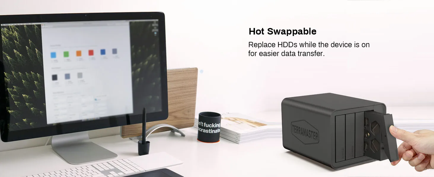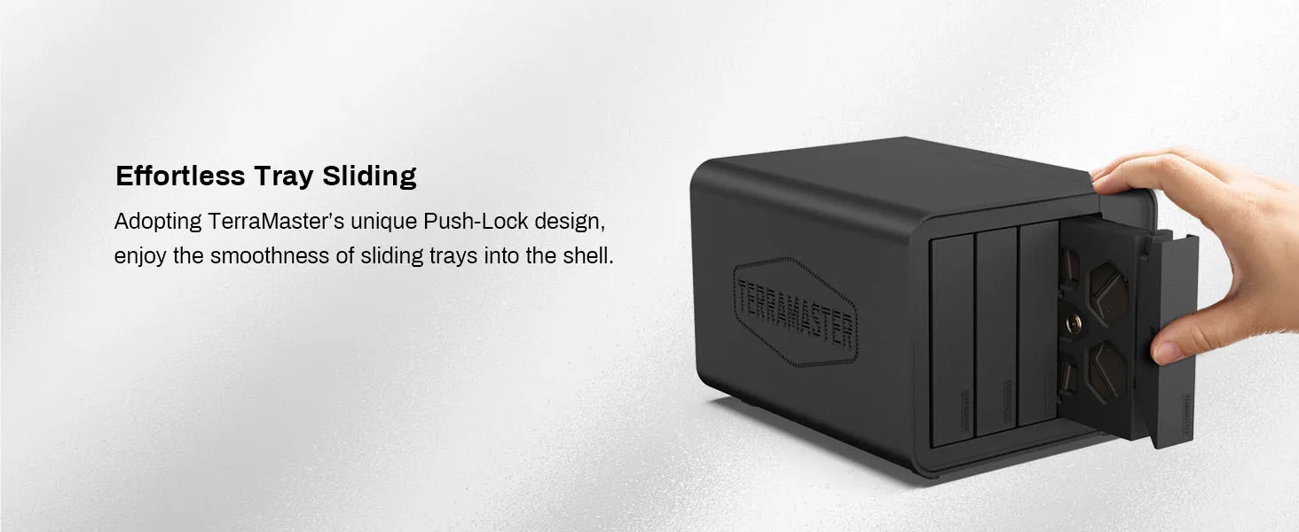 La carcasa de disco duro de la serie de discos duros, con un revolucionario soporte sin herramientas con un diseño de bloqueo a presión, lo que permite una instalación rápida y segura sin necesidad de herramientas. Este diseño innovador garantiza una transmisión de datos estable, mejorando en gran medida la eficiencia del reemplazo del disco duro. El intercambio de discos duros se convierte en un proceso perfecto, proporcionando una mayor comodidad para los usuarios que cambian de unidad con frecuencia. Además, El D4-320 es excepcionalmente silencioso durante su funcionamiento, gracias a sus paneles especializados de absorción de sonido y amortiguación de vibraciones, que reducen los niveles de ruido hasta un 50% en comparación con la generación anterior, caer por debajo de 21 dB(A) en modo de espera para un entorno de usuario notablemente silencioso.