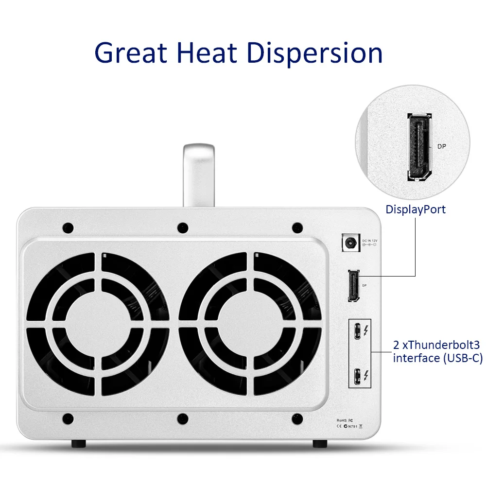 La entrega de energía proporciona hasta 15W de potencia para recargar portátiles compatibles (solo Mac, no es compatible con Windows). Carcasa de aleación de aluminio, 2 ventiladores de 80mm garantizan una gran dispersión del calor.