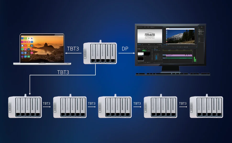 Equipado con dos interfaces Thunderbolt 3, el almacenamiento RAID TerraMaster D5 Thunderbolt 3 permite a los usuarios conectarse con cualquier dispositivo USB a 8 veces la velocidad del USB 3,0, al tiempo que admite un rendimiento de vídeo 4K completo.