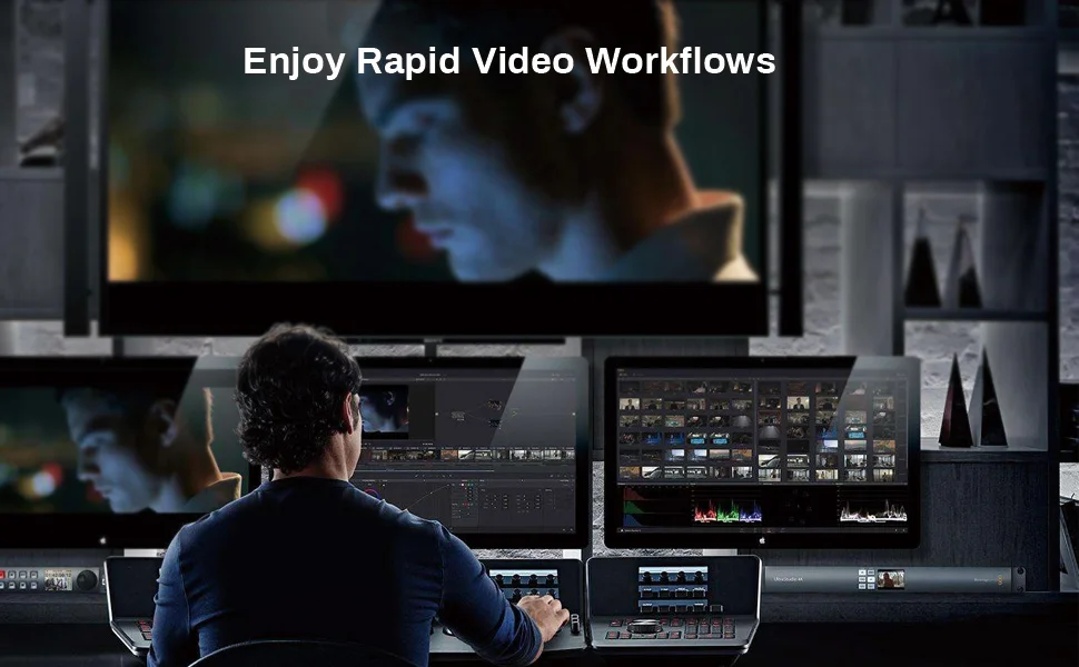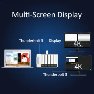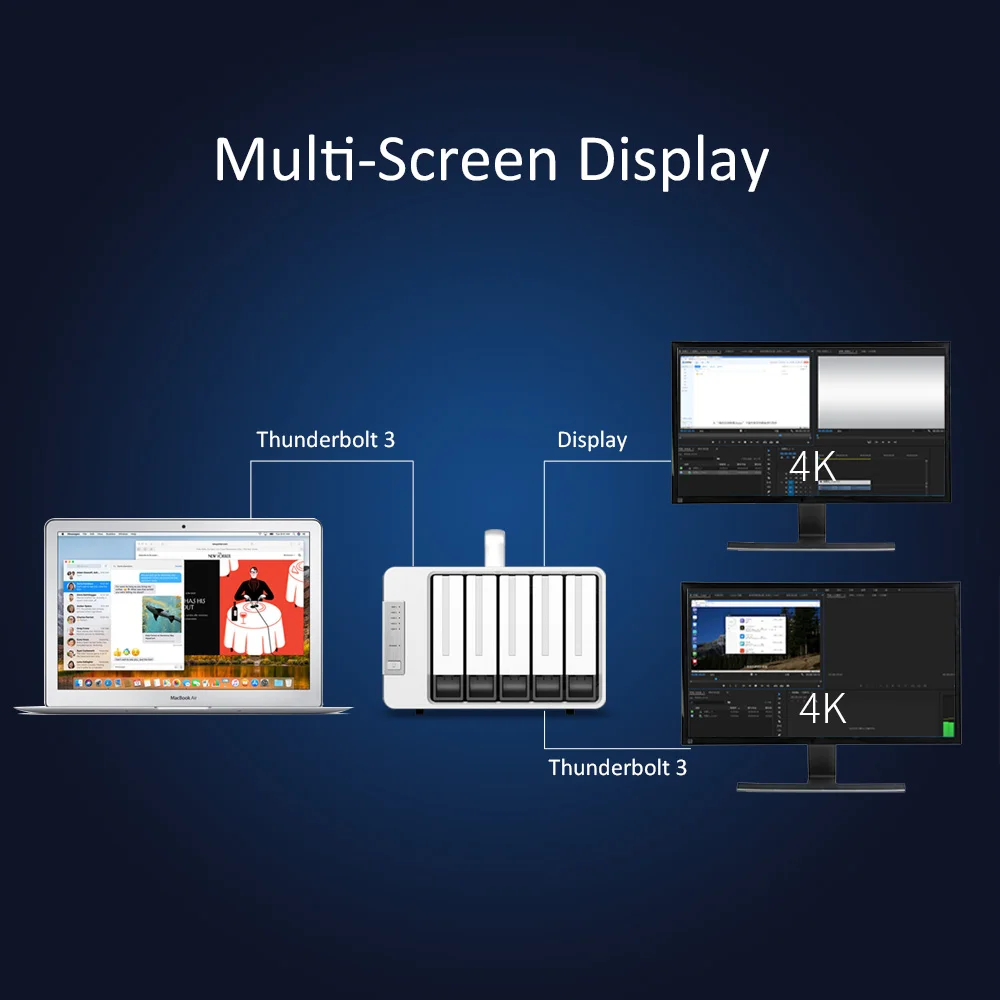Aprovechando las interfaces Thunderbolt 3 y DP, El D5 Thunderbolt 3 admite pantallas múltiples con hasta 3 monitores o hasta 6 dispositivos en cadena. Esta es una solución ideal para multitarea, especialmente cuando la eficiencia es el objetivo final. Los dispositivos Thunderbolt 2 con la función de cadena de margaritas también se pueden conectar a la D5 Thunderbolt 3.