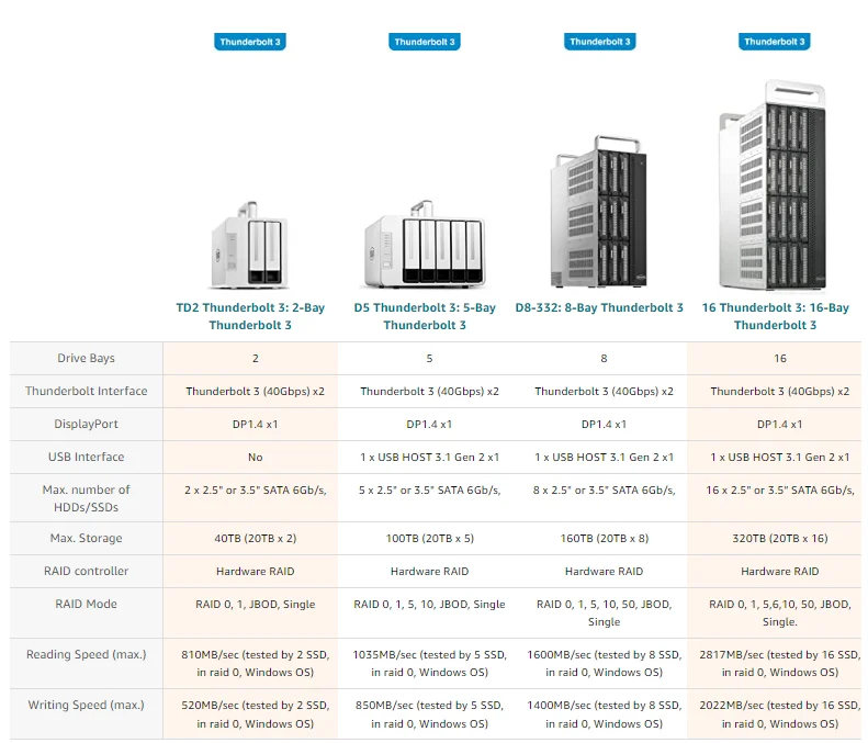 Dos interfaces Thunderbolt 3 DE 40Gbps, velocidades de transferencia de hasta 1035 MB/s (con SSHD en RAID 0). Compatible con HDD SATA de 3,5 "y 2,5", SSD SATA de 2,5 ". Para un rendimiento mejor y estable, se recomiendan los discos duros Seagte IronWolf o los WD rojos (excepto los 8TB).
