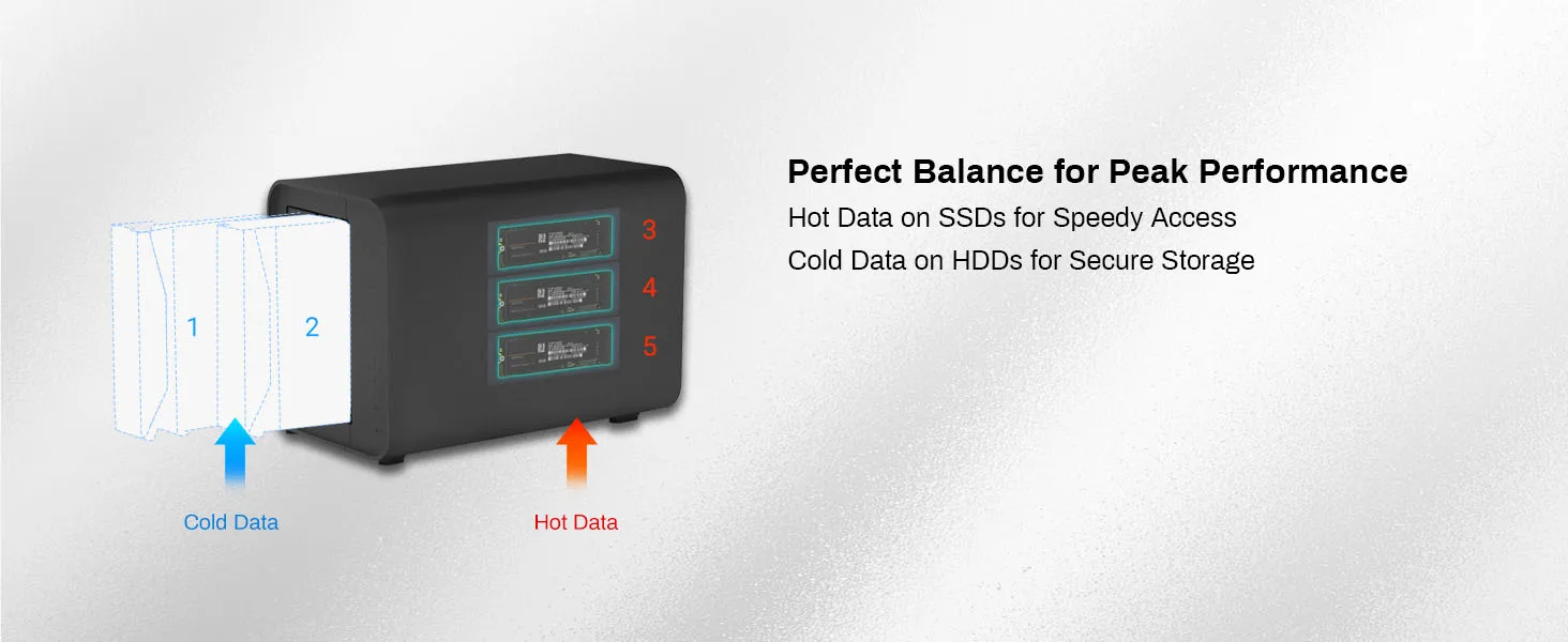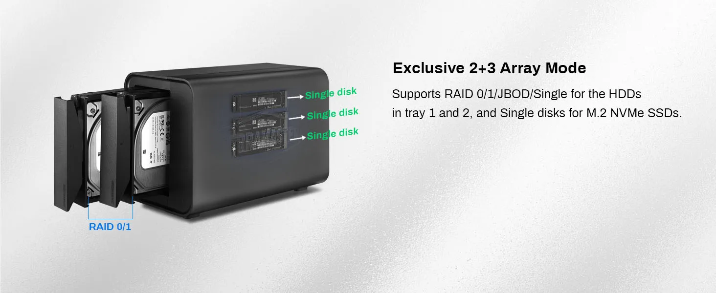 La carcasa D5 Hybrid RAID implementa el modo RAID exclusivo 2 + 3 DE TERRAMASTER. Al utilizar dos HDD/SSD SATA en la bandeja 1 y 2, los usuarios pueden configurar RAID 0, RAID 1, JBOD o Single Disk, satisfaciendo diversos requisitos de almacenamiento de datos en frío en diversas aplicaciones. Además, las tres ranuras SSD NVMe M.2 admiten exclusivamente el modo de disco único, lo que las hace ideales para almacenar datos calientes de acceso frecuente, lo que garantiza velocidades de transferencia rápidas.