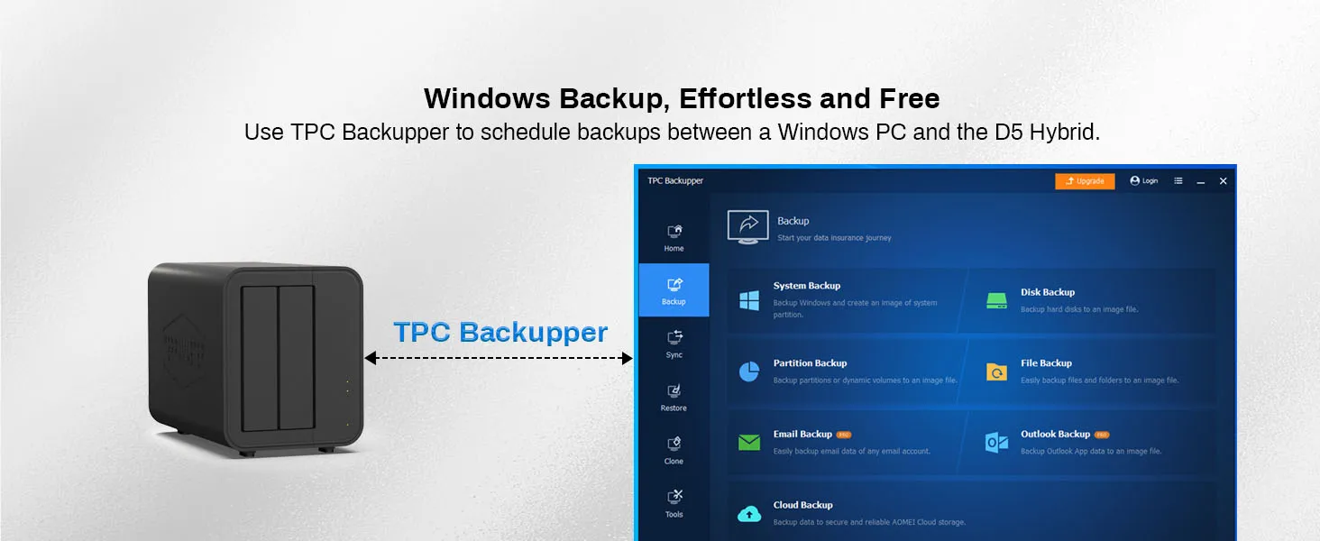 La copia de seguridad TPC gratuita de TERRAMASTER simplifica las copias de seguridad de PC con Windows. Los usuarios pueden programar copias de seguridad de carpetas o particiones de disco en el almacenamiento USB HDD de TERRAMASTER o servidores NAS sin esfuerzo. Simplemente conecte, instale y configure su tarea de copia de seguridad. TPC Backupper admite estrategias de copia de seguridad incrementales y diferenciales y es compatible con Windows 8/8.1/10/11.