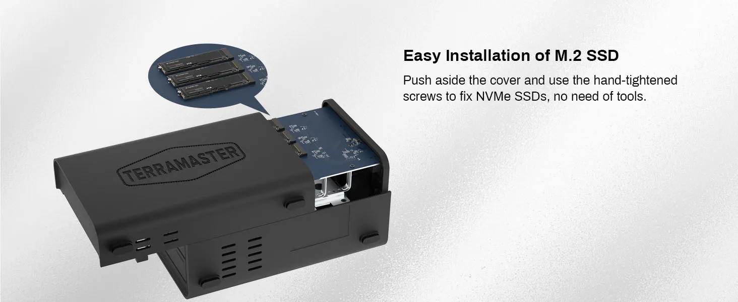 La carcasa del disco duro híbrido D5 simplifica el proceso de reemplazo del disco duro con su bandeja sin herramientas, eliminando la necesidad de herramientas adicionales. Con el diseño Push-Lock de TERRAMASTER, garantiza una inserción segura, evitando la desconexión o problemas fuera de línea. Para los SSD M.2, el chasis del D5 Hybrid está equipado con una práctica cubierta deslizante lateral y tornillos apretados a mano, lo que permite una rápida instalación del SSD en solo 5 segundos. El D5 Hybrid también es una carcasa HDD USB súper silenciosa. Además de incorporar medidas adicionales de amortiguación, los ingenieros de TERRAMASTER han diseñado numerosos paneles especiales de absorción de sonido en la nueva estructura para minimizar el ruido. Las pruebas han demostrado que la nueva estructura que adopta el D5 Hybrid alcanza niveles de ruido 50% más bajos que los de la generación anterior, ¡con un nivel de ruido en modo de espera de solo 19dB(A)!
