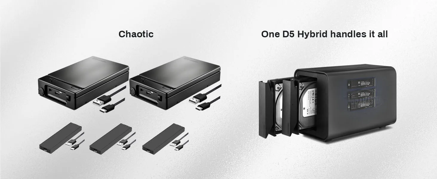 El almacenamiento híbrido USB D5 es la primera matriz de discos híbridos de conexión directa de la industria. Esta innovadora solución admite hasta 2 HDD/SSD SATA y 3 M.2 2280 NVMe SSD, aprovechando las ventajas de la gran capacidad de los HDD y el rendimiento de alta velocidad de los SSD. La carcasa D5 híbrida externa HDD SSD optimiza el almacenamiento mediante el uso de discos duros para datos fríos de acceso poco frecuente y SSD para datos calientes de acceso frecuente. Con el software de copia de seguridad TPC Backupper gratuito de TERRAMASTER, puede programar fácilmente copias de seguridad de datos calientes en HDD, mejorando la seguridad de sus datos. ¡Experimente la eficiencia del almacenamiento híbrido con el D5 Hybrid!