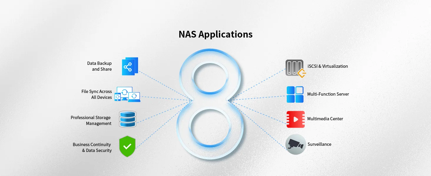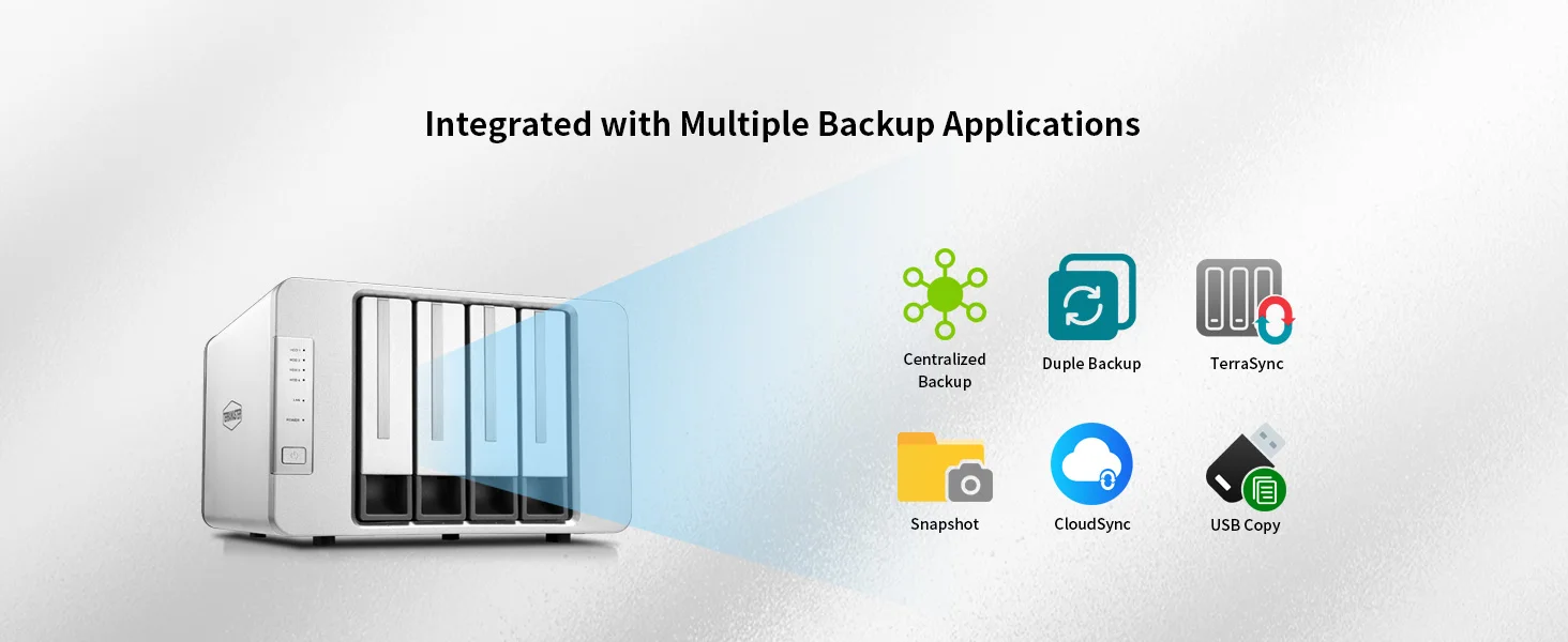 Integrado con múltiples aplicaciones de copia de seguridad, incluyendo copia de seguridad centralizada, copia de seguridad doble, CloudSync, TerraSync y más, este almacenamiento conectado a la red informática utiliza interfaces de usuario visuales y tecnologías de almacenamiento confiables para proteger sus valiosos datos.