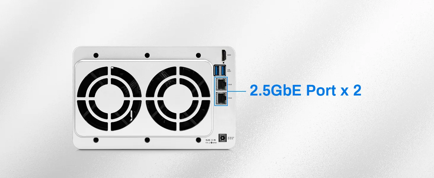 El almacenamiento de la red NAS de 2,5 está configurado con dos interfaces de 2,5 GbE, que admiten un ancho de banda de red de alta velocidad de GbE. La velocidad de transmisión puede alcanzar los 283 MB/s (discos duros NAS dedicados 18TB x 2, RAID 0). La agregación de enlaces proporciona un ancho de banda de red de hasta 5 Gb.