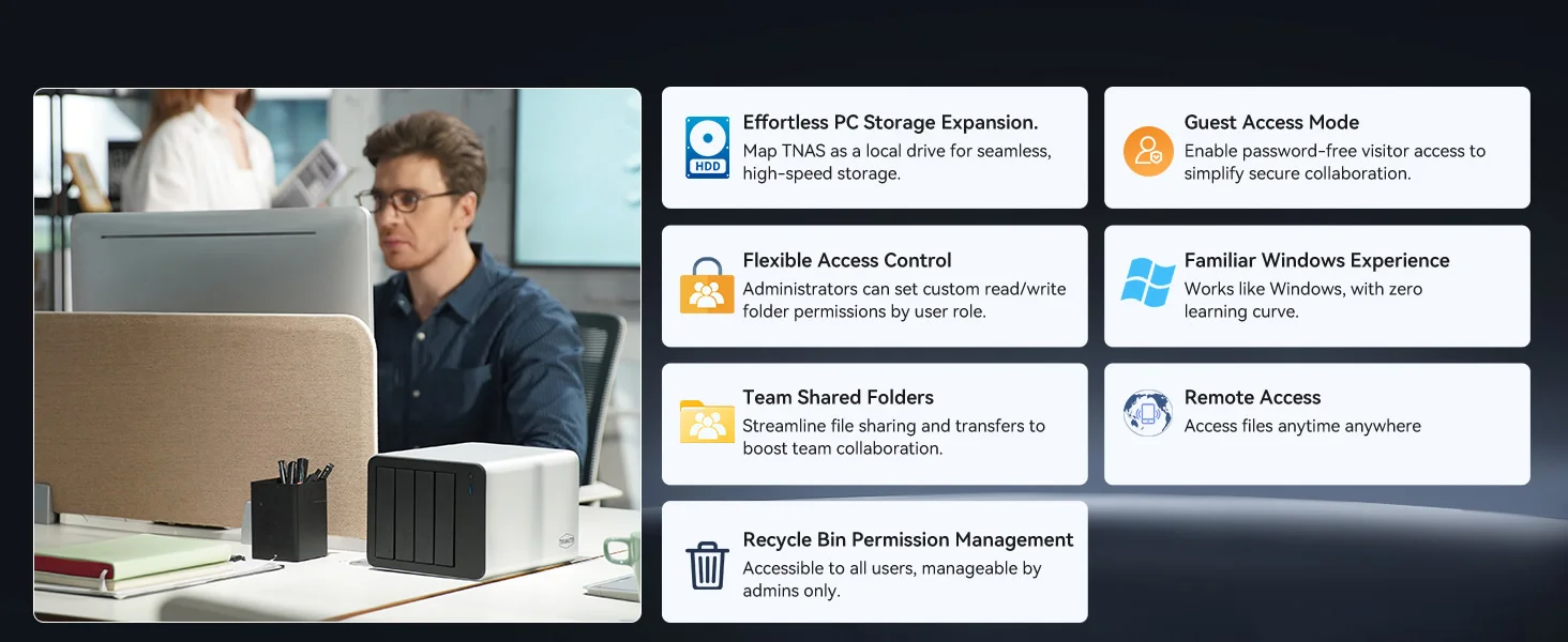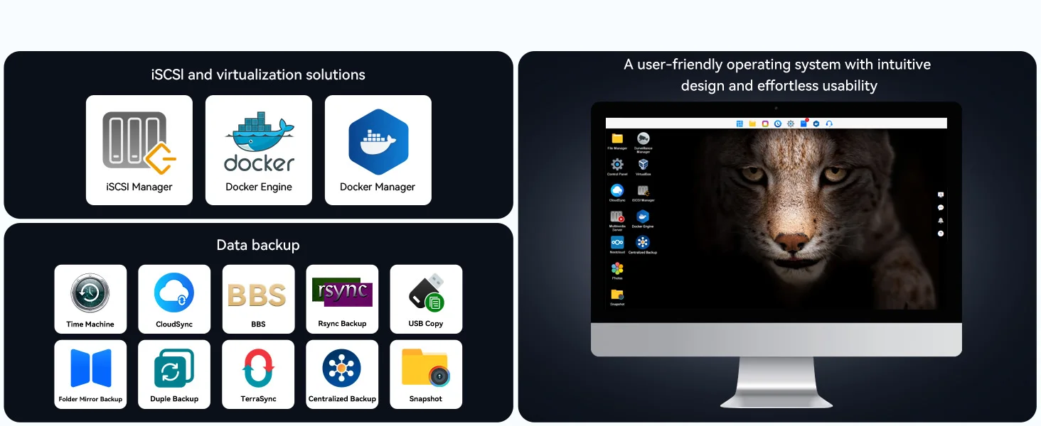 Ultrasilencioso y fácil de usar:Diseñado para un uso silencioso en el hogar y la oficina, el sistema ejecuta el sistema operativo TOS 6 intuitivo, que presenta una interfaz renovada, configuración con un solo clic y administración sencilla basada en la web sin necesidad de habilidades de línea de comando.