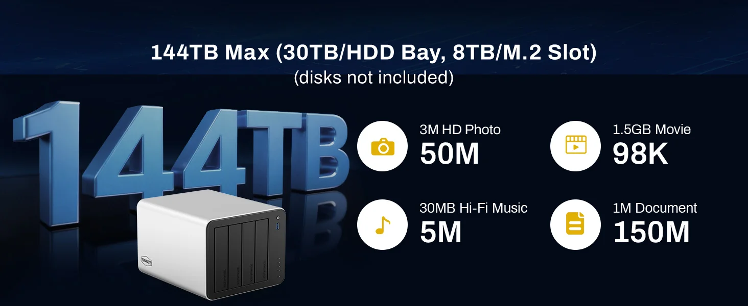 Gran almacenamiento y seguridad:Al admitir hasta 144 TB (4× HDD + 3× M.2 SSD), ofrece almacenamiento escalable con instantáneas TRAID, TFSS y protección HyperLock-WORM.Sus datos permanecen seguros con cifrado multicapa, políticas de firewall y resiliencia resiliencia.
