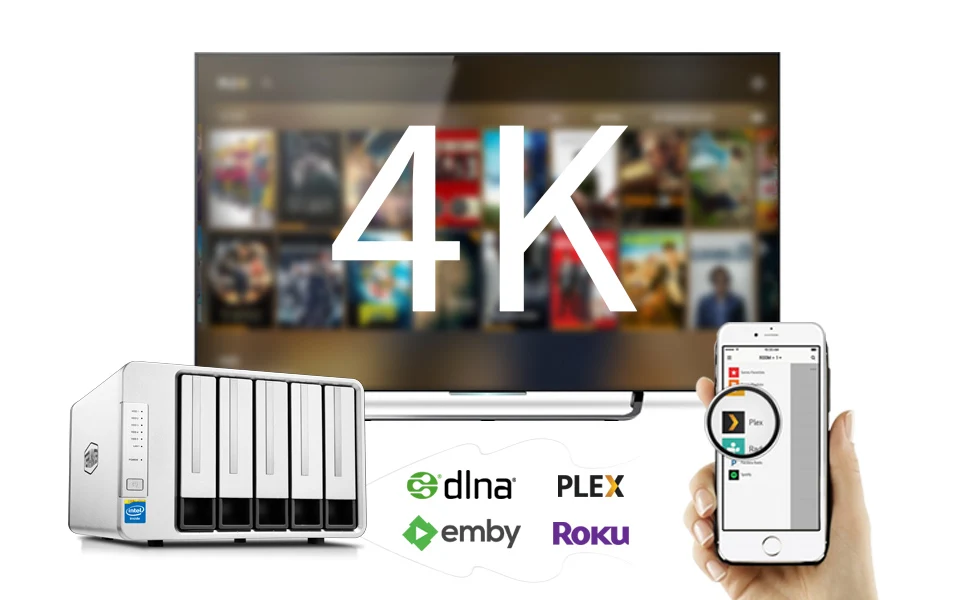 La transcodificación de hardware en vivo de hasta dos transcodificaciones de VIDEO 4K simultáneas proporciona una reproducción de video sin complicaciones y de alta calidad entre varios dispositivos, incluidos televisores de alta definición, reproductores multimedia digitales, teléfonos móviles y ordenadores en el formato requerido, lo que facilita ver toda su biblioteca multimedia sin tener que instalar un reproductor de terceros.