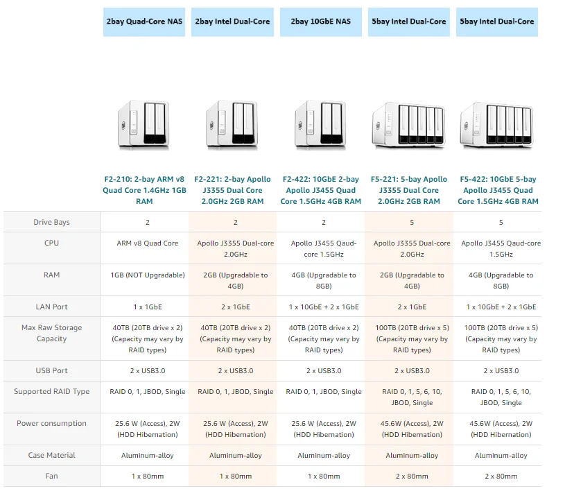 La unidad NAS de 5 bahías de TerraMaster, con un procesador Intel Apollo J3355 de doble núcleo, una frecuencia de hasta 2,0 GHz, una velocidad de lectura que alcanza los 200 MB/s, y una velocidad de escritura que alcanza hasta 190 MB/s. Para un rendimiento estable y mejor, utilice WD Reds o Seagate IronWolfs.
