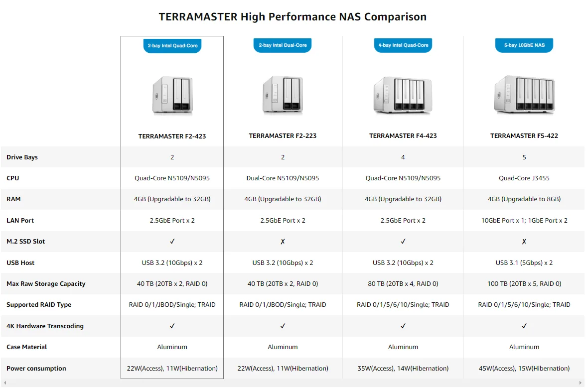 Comprar TERRAMASTER-servidor de almacenamiento de red F4-223, CPU de doble núcleo N4505, memoria DDR4 de 4GB, Puerto 2.5GbE x 2 (sin disco)