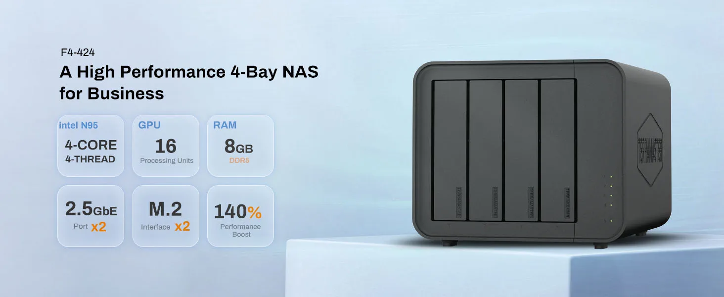 Hardware potente:El almacenamiento NAS F4-424 cuenta con una CPU N95 de cuatro núcleos y 4 hilos de 3,4 GHz (turbo), GPU UHD integrada a 0,75 GHz, memoria DDR5 de 8 GB y 4800 MHz (no ECC, actualizable hasta 32 GB), puertos Ethernet duales de 2,5 G y Ranuras NVMe M.2 duales para almacenamiento de SSD.