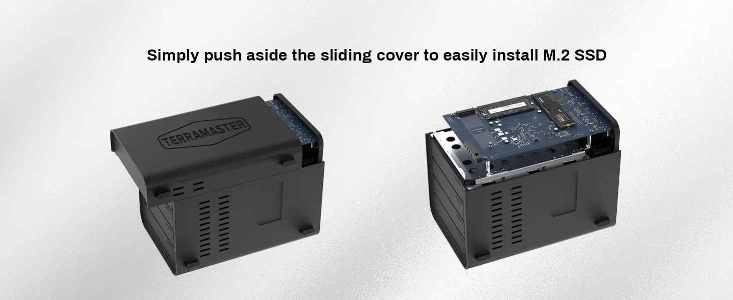 Instalación sencilla de SSD M.2:TerraMaster agiliza el manejo de SSD M.2 en el servidor NAS F4-424 con una cubierta deslizante lateral, lo que permite una instalación de SSD rápida y sencilla.La inclusión de tornillos apretados a mano garantiza un proceso de instalación sin complicaciones.El F4-424 NAS adopta una bandeja de disco duro sin herramientas, lo que elimina la necesidad de herramientas adicionales durante la instalación del disco duro.Además, el innovador diseño Push-Lock de TerraMaster asegura automáticamente los discos duros insertados, evitando la desconexión accidental o problemas fuera de línea.