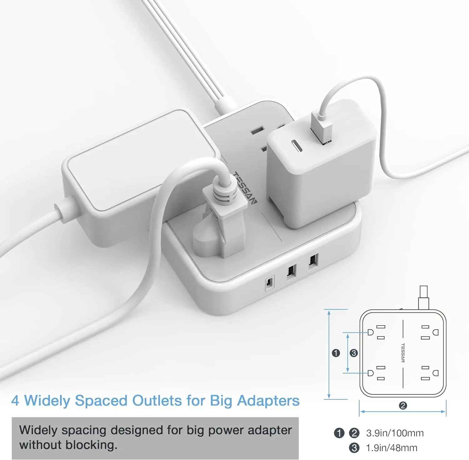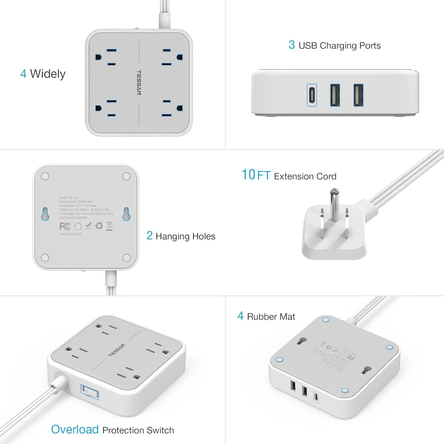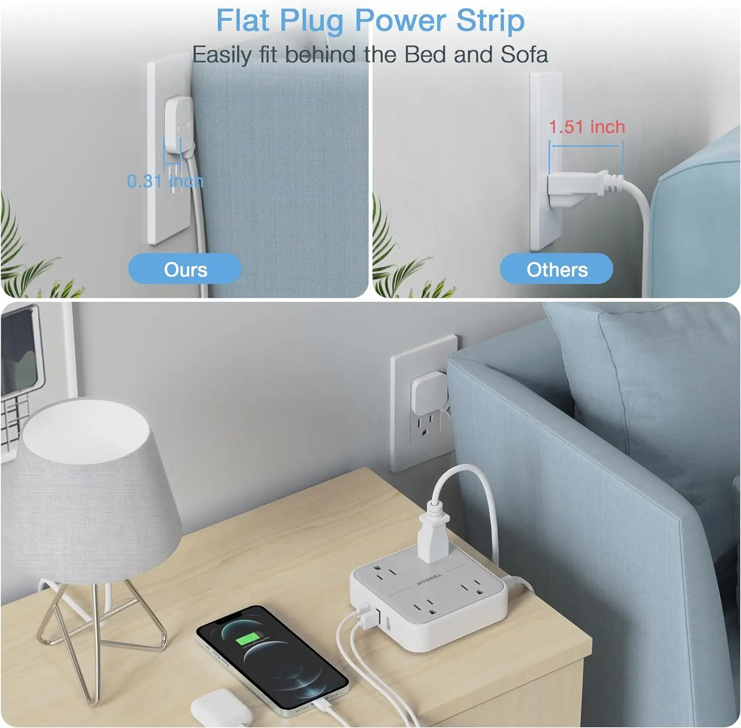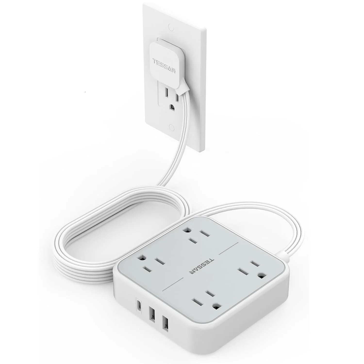 Comprar TESSAN-regleta de alimentación de enchufe plano con 4 salidas de Ca + 2 puertos USB + 1 enchufe eléctrico tipo C 7 en 1 con cable de extensión ultrafino de 10 pies