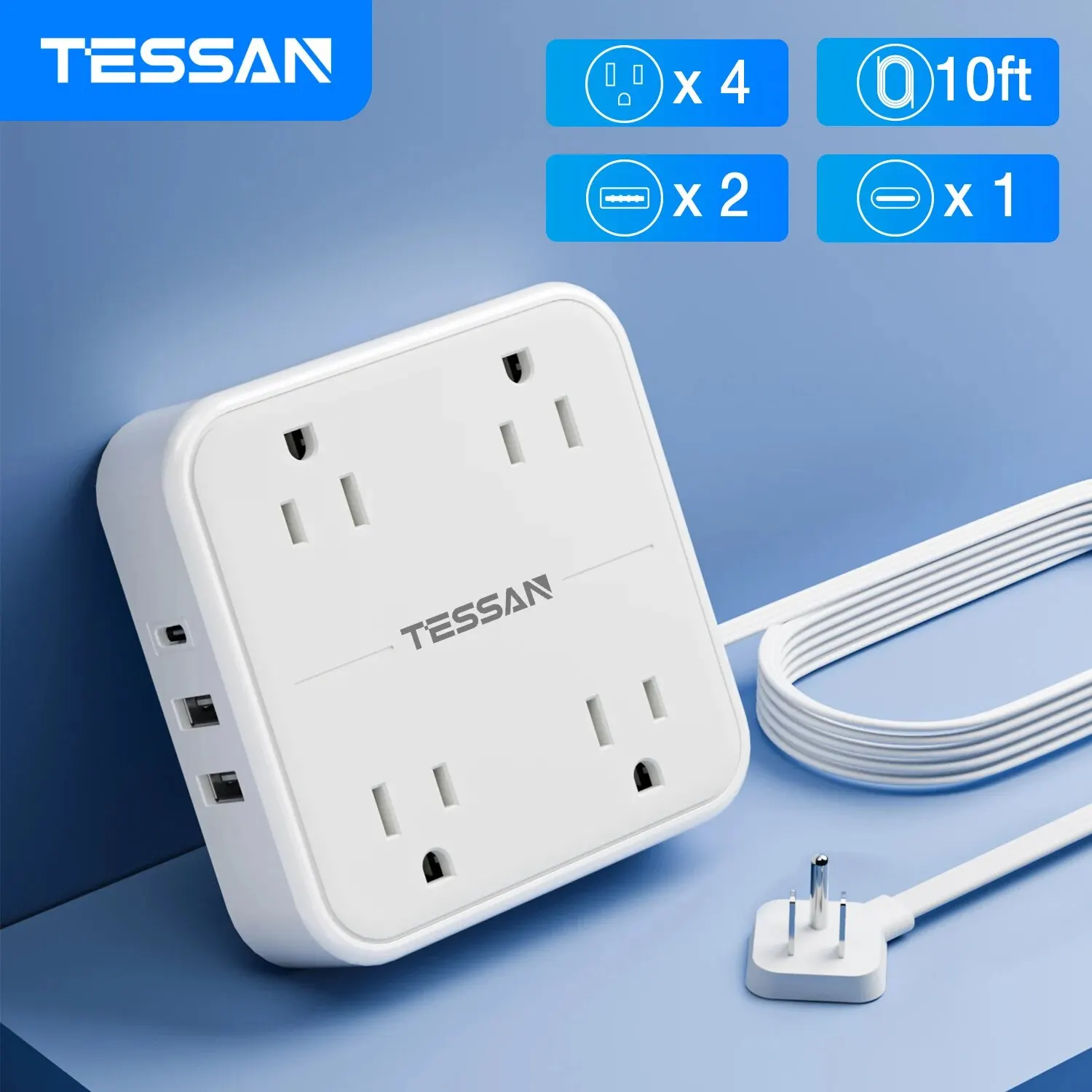 Comprar TESSAN-regleta de alimentación de enchufe plano con 4 salidas de Ca + 2 puertos USB + 1 enchufe eléctrico tipo C 7 en 1 con cable de extensión ultrafino de 10 pies