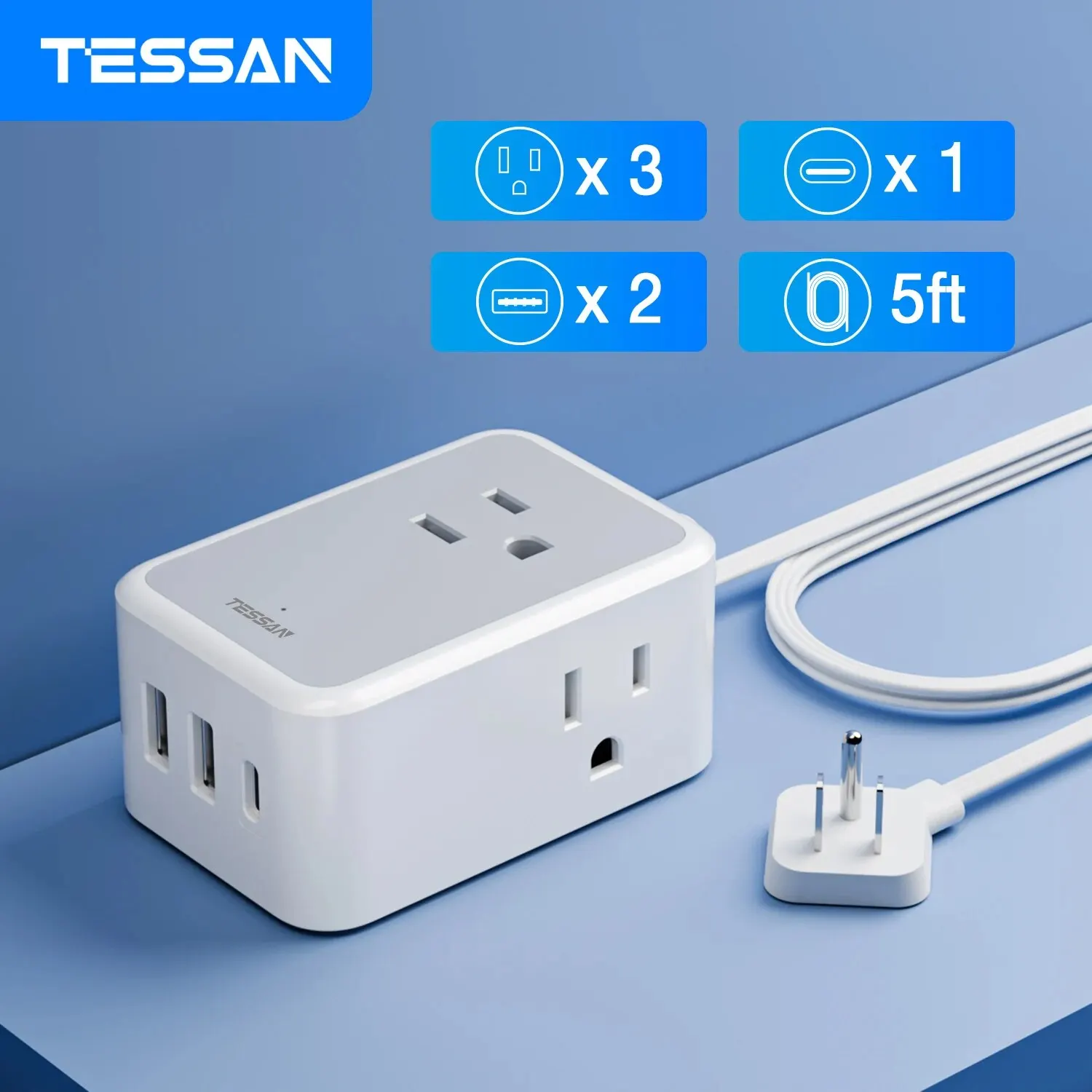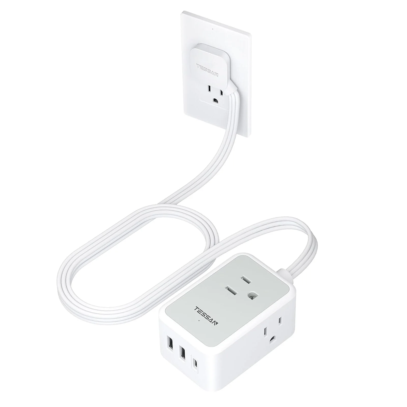 Comprar TESSAN-regleta de alimentación de enchufe plano pequeño con 3 tomas, 2 puertos USB, 1 enchufe de viaje tipo C 6 en 1 con cable de extensión ultrafino de 5 pies