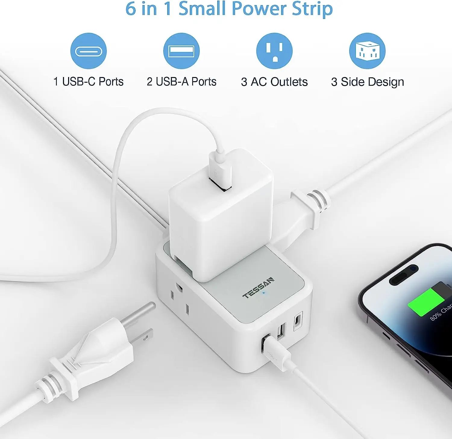 Práctico tamaño de cubo de 3 lados con 3 salidas múltiples, 2 puertos de 2 y 1 puerto de 1 a 1, haga que este cable de extensión plano de 3 clavijas se expanda para cargar 6 dispositivos simultáneamente. Minimice el espacio desperdiciado de su escritorio de oficina en casa o bolsa de viaje