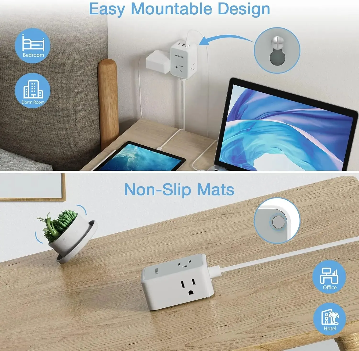 Viene sin protección contra sobretensiones, esta mini regleta de alimentación es absolutamente imprescindible para los accesorios de crucero; El cable de extensión de salida plana es compacto y lo suficientemente ligero como para caber en su equipaje y mochila, fácil de llevar para viajes esenciales