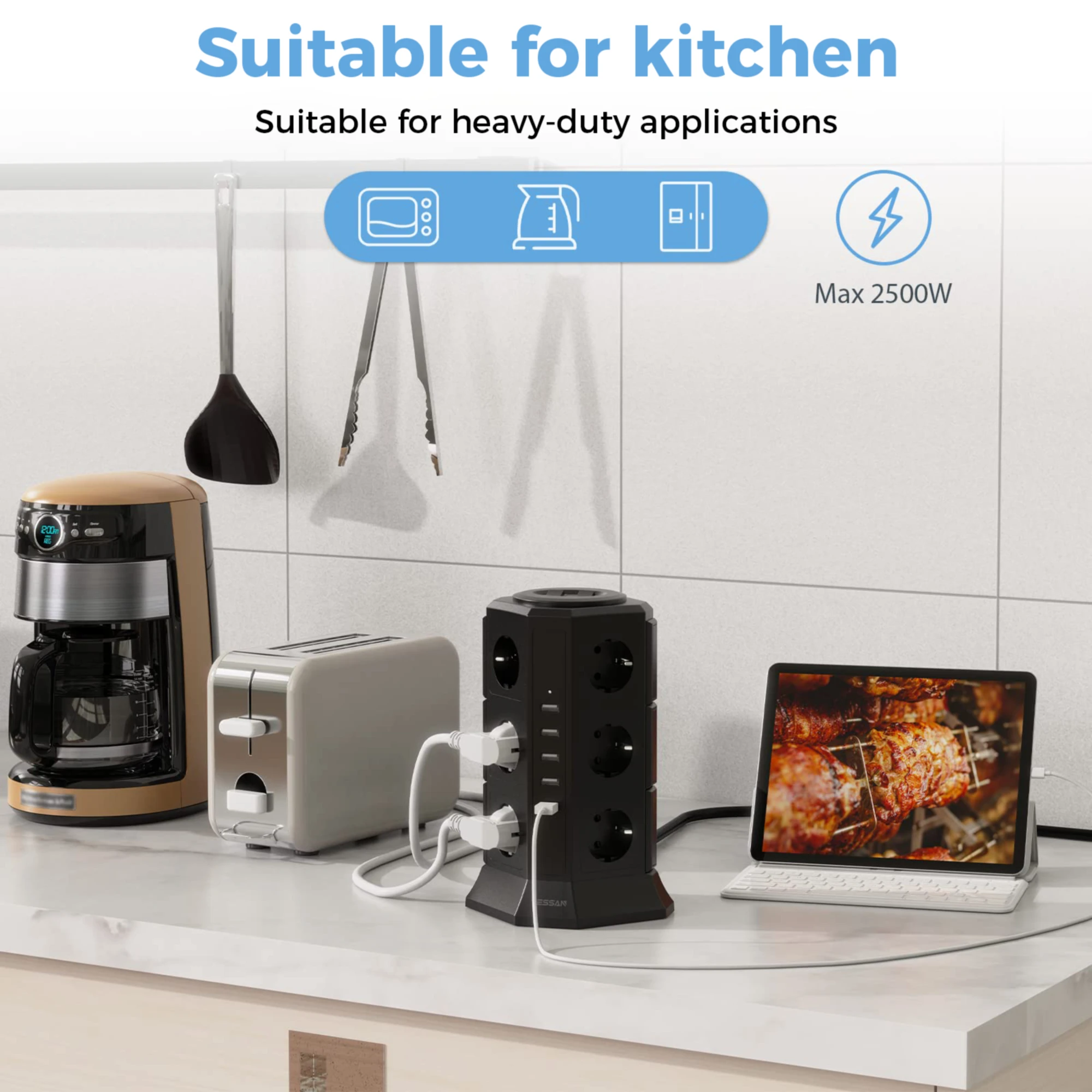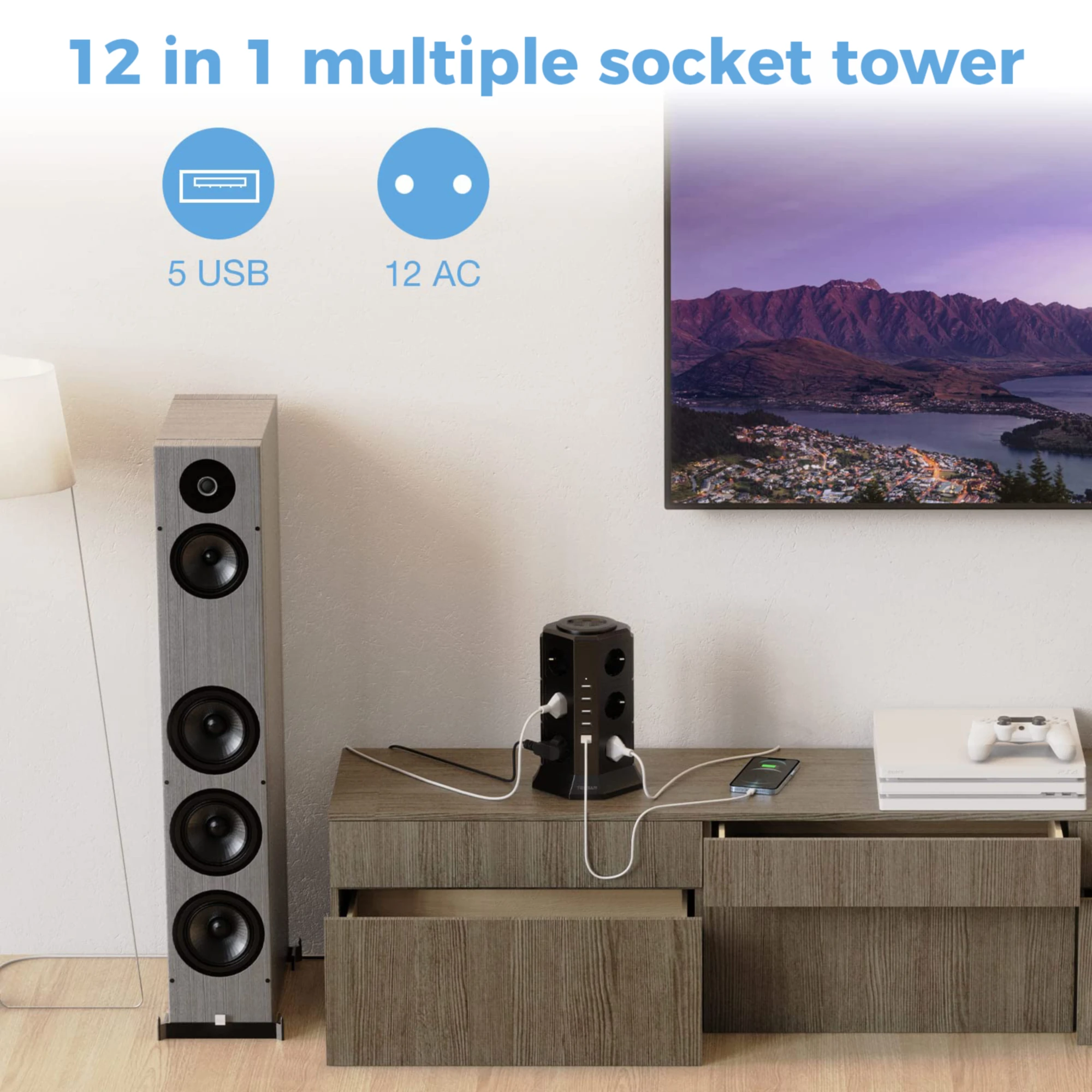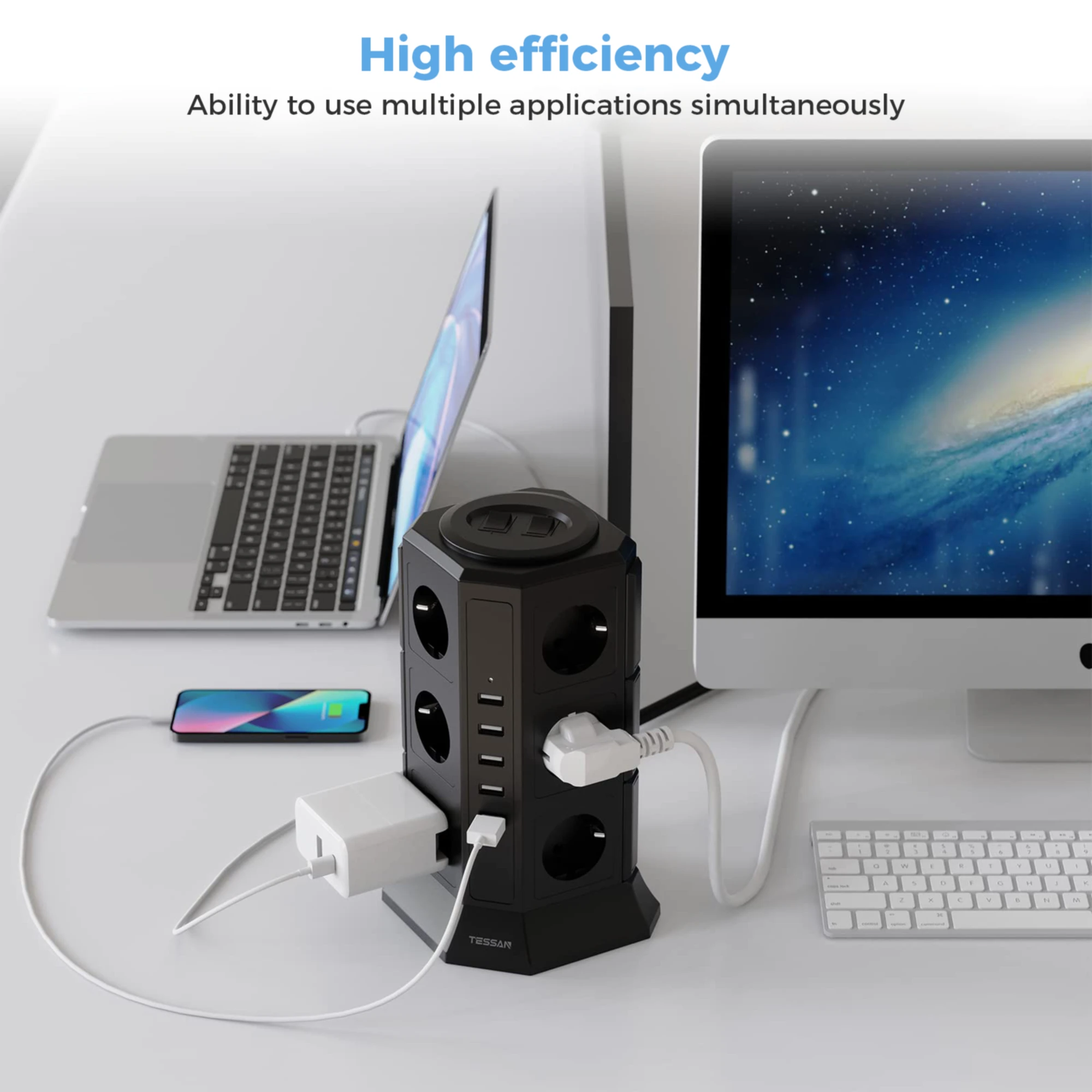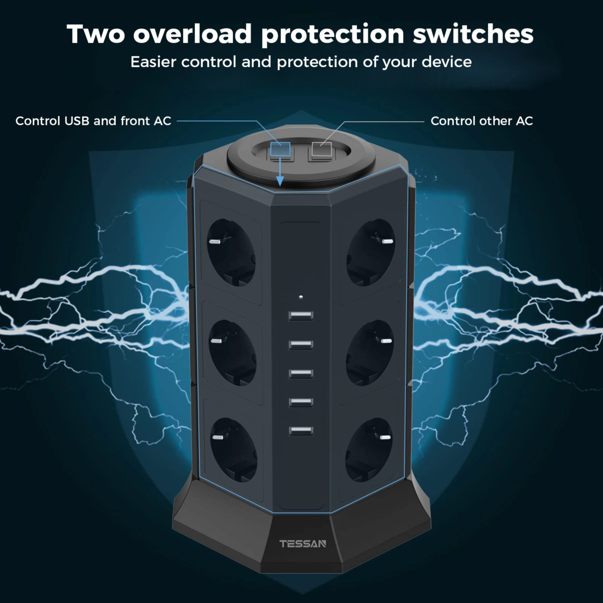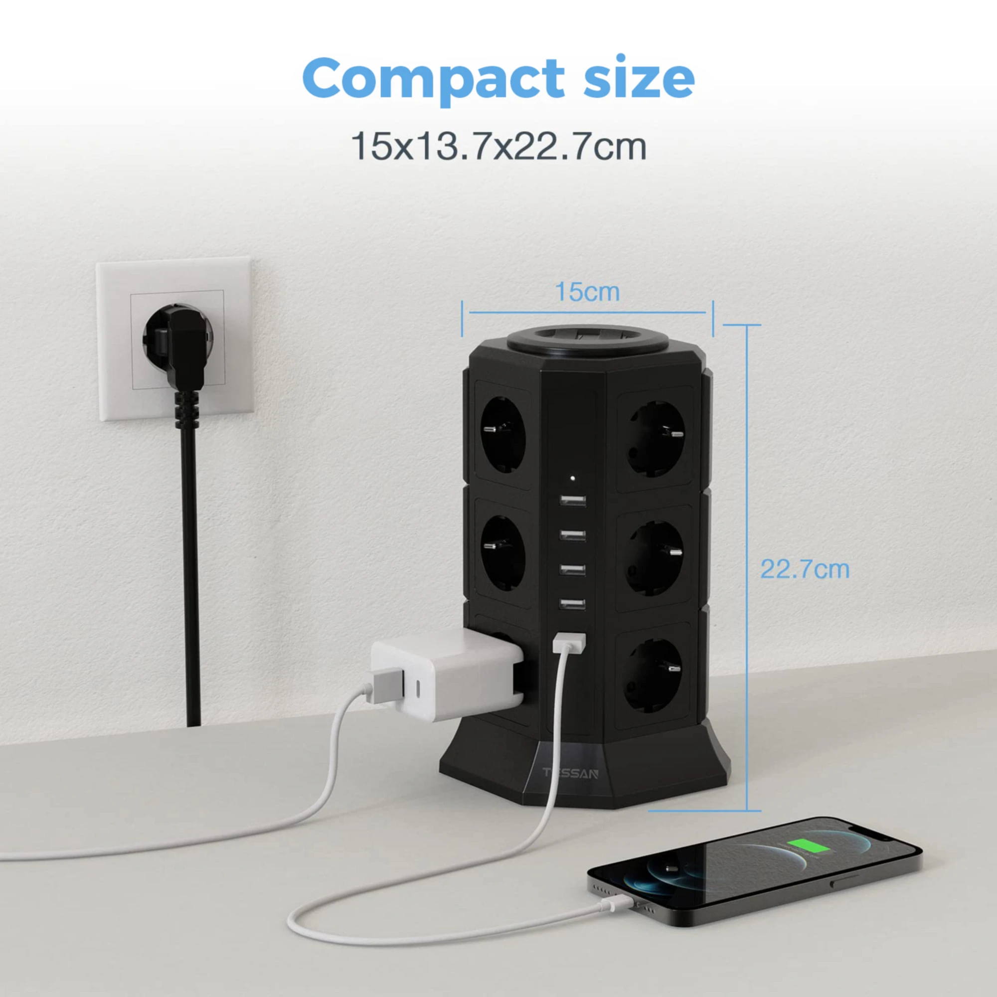 Las múltiples ranuras de 12 enchufes están distribuidas verticalmente en las 4 superficies de los múltiples enchufes. El enchufe de Distribución ofrece suficiente espacio para que cada ranura individual ahorre espacio y los 5 puertos USB De La Torre de enchufe son un Smart IC integrado con una corriente total de 4,5 A. Puede detectar automáticamente sus dispositivos y ofrece la corriente más rápida posible, hasta 2,4 A por puerto.
