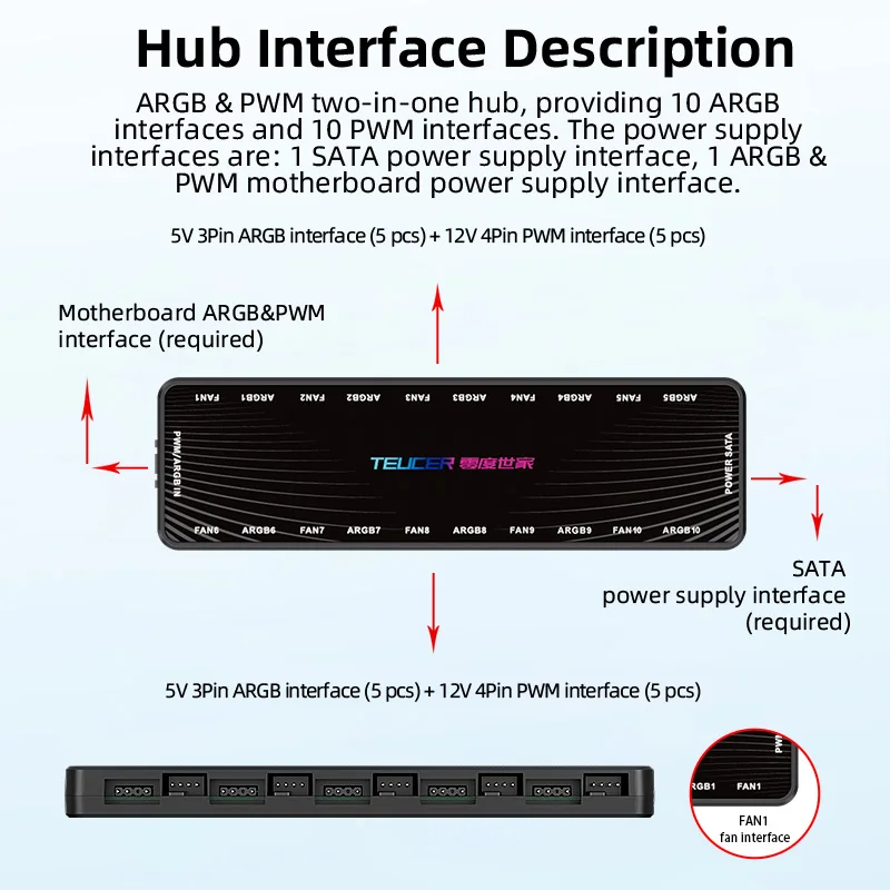 Hay 5 interfaces PWM de 4 pines + interfaces de ventilador ARGB en cada lado, que son compatibles con ventiladores convencionales de 4 pines/3 pines.La interfaz FAN1 se utiliza para transmitir información sobre la velocidad del ventilador a la placa base.Las interfaces FAN2-FAN10 aún tienen función PWM y ajuste de velocidad, pero no pueden mostrar la velocidad.